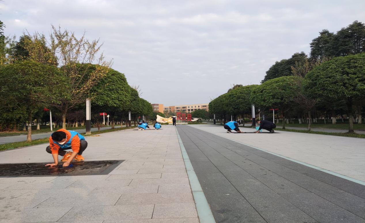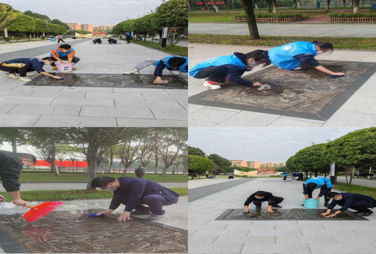 在党总支书记王文杰的带领下,师生党员、入党积极分子拿起提前准备好的水桶、干净、柔软的抹布等清洁工具,耐心细致的投入校园大道上校史浮雕的清洁工作中。