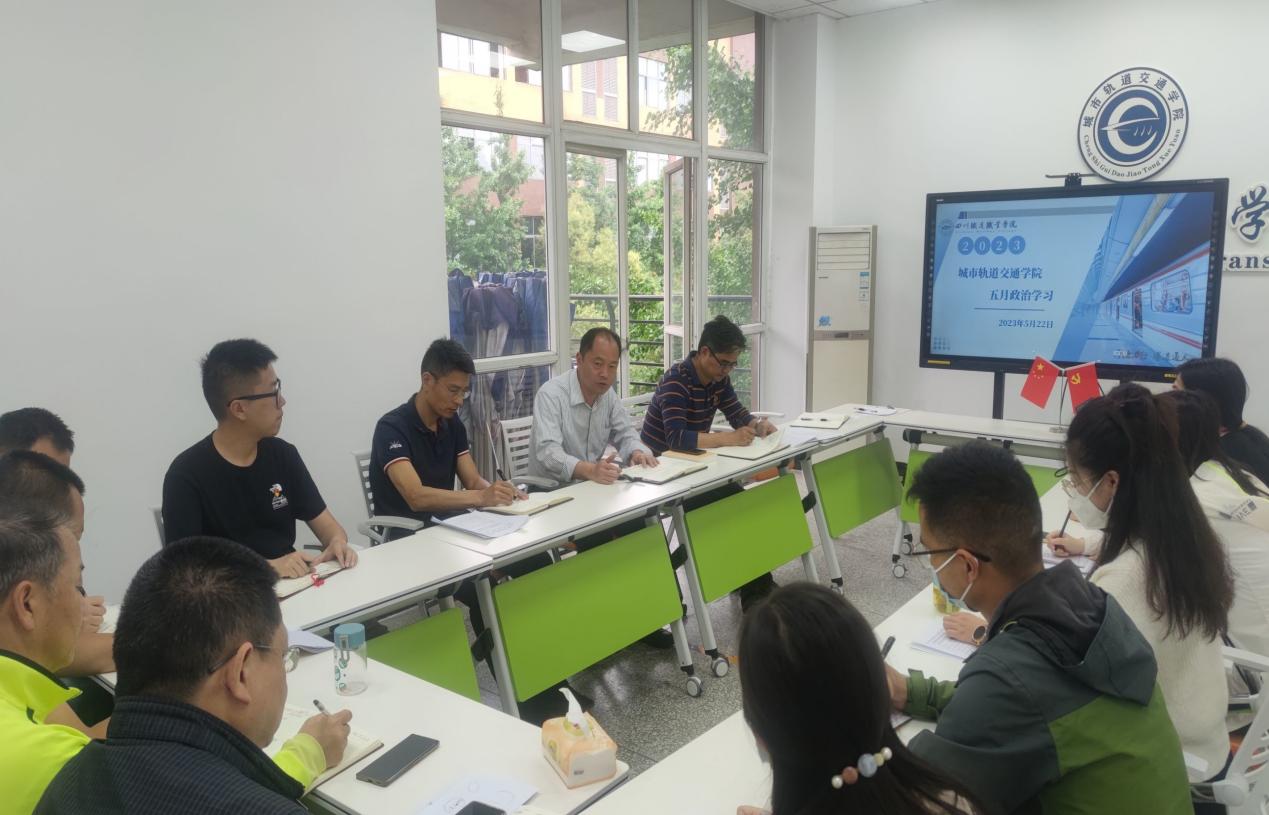 根据中共四川省委宣传部和中共四川省委组织部对高校政治学习重点内容相关要求,结合学校党委宣传统战部具体安排,城市轨道交通学院于5月22日下午于一教三楼会议室组织全体教职工开展五月政治学习,校党委副书记刘昊君、纪委副书记吴东参加本次学习,城市轨道交通学院党总支书记王文杰主持会议。