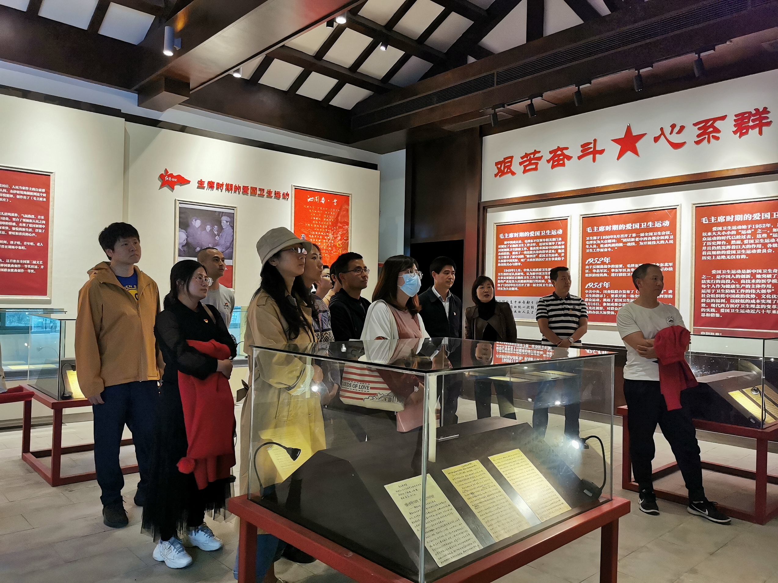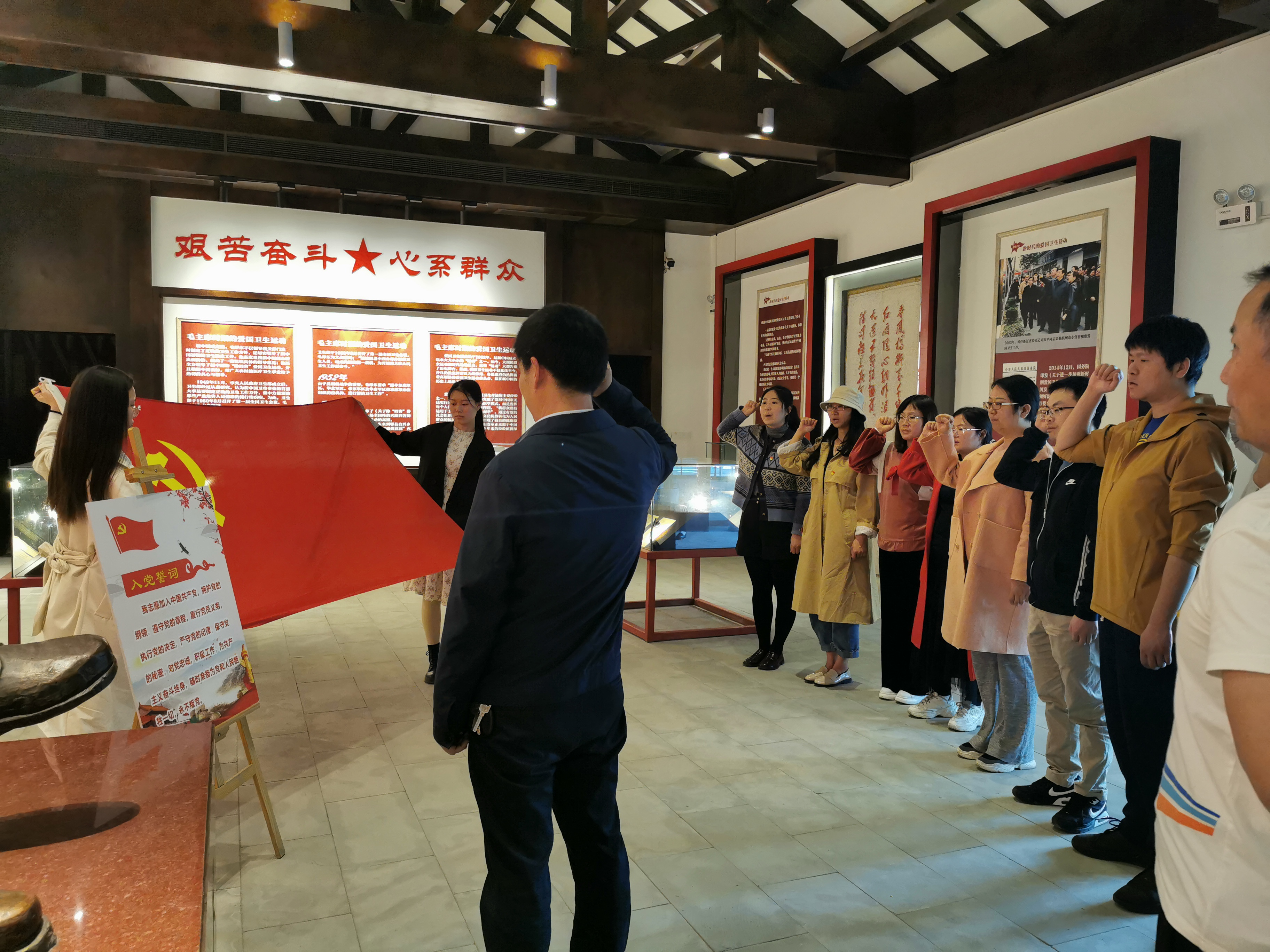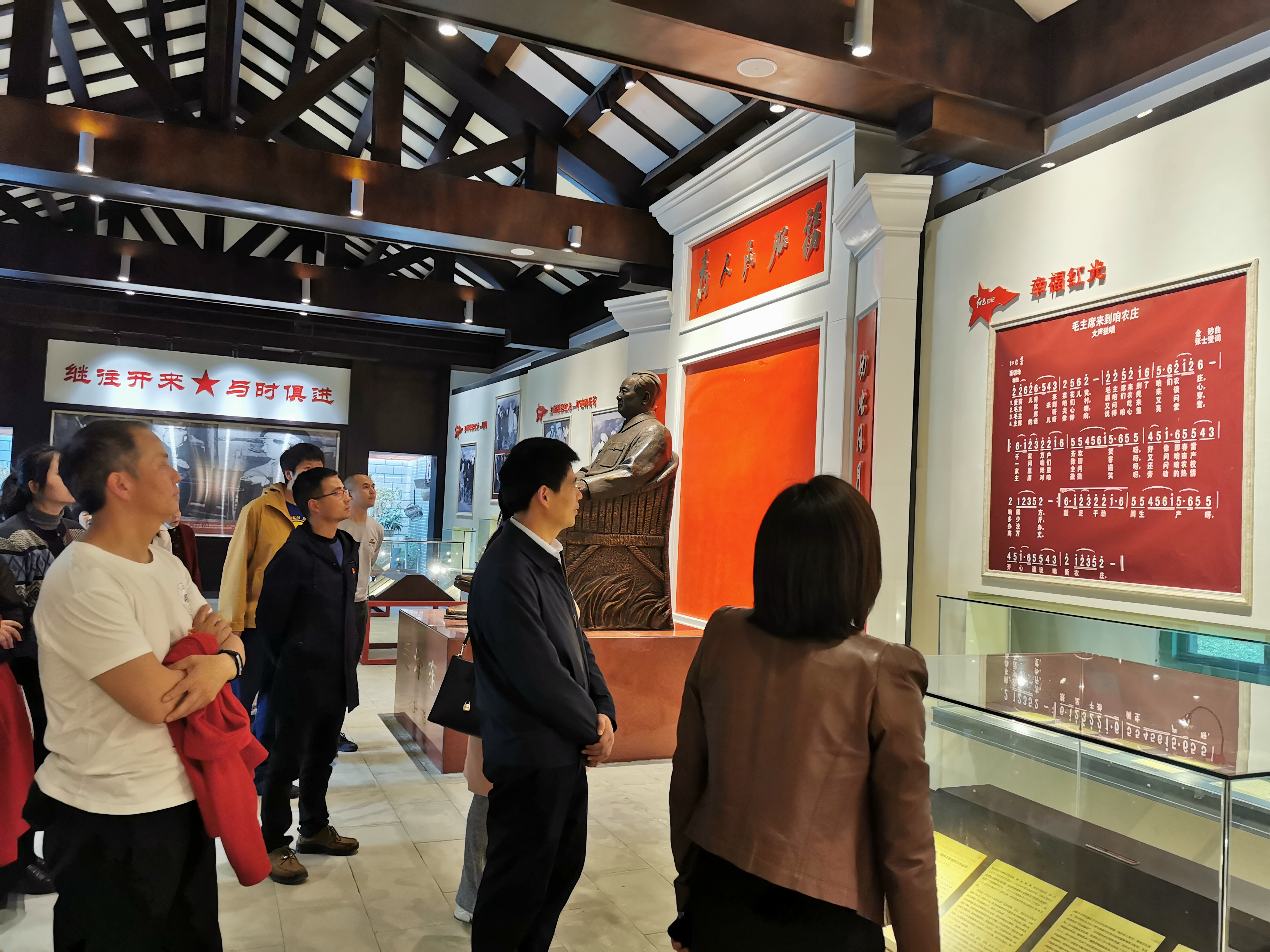 本次活动主要分为参观学习、重温入党誓词、向毛主席雕像鞠躬致敬三个部分。讲解员首先带领我系全体党员及学生发展对象参观了“幸福亭”,1958年3月16日,毛主席到郫县合兴乡红光农业合作社视察,为纪念毛主席视察红光高级农业合作社这一事件,合作社社员们于1960年修建了幸福亭,据悉,该亭取名“幸福亭”,寓意毛主席领导工农大众翻身得解放,又带领中国人民走上社会主义的幸福康庄大道。参观完毕“幸福亭”,同志们进入展览室内进行参观,并认真聆听了讲解员的解说,学习了毛主席视察红光社的历史经过及毛主席时期的爱国卫生运动,参观了毛主席诗作如《送瘟神》、《沁园春·雪》及其他文史资料。随后,城轨车辆系党总支书记龙明贵同志带领全系党员同志们在纪念馆大厅面向党旗重温了入党誓词,并集体面向毛主席铜像鞠躬致敬,以此深切缅怀毛泽东同志等代表的老一辈无产阶级革命家的丰功伟绩。