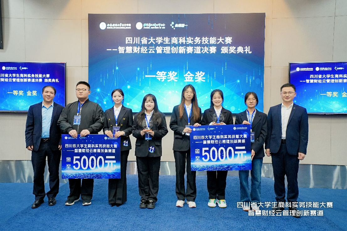 10月12日,由西南财经大学与金蝶精一信息科技服务有限公司联合承办的四川省大学生商科实务技能大赛(2025)智慧财经云管理创新赛道决赛在西南财经大学圆满落幕。学院王一雯、车雨萌、杨安康学生团队凭借出色表现,荣获高职组第一名、一等奖金奖。