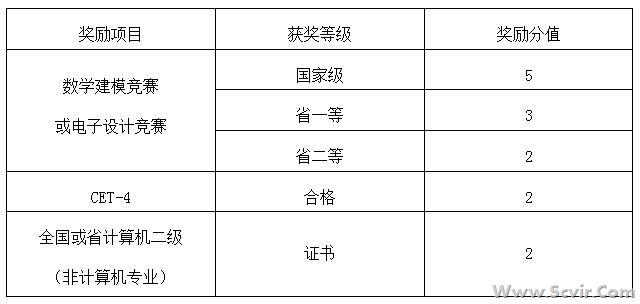 (2)在校期间,在数学建模竞赛、电子设计竞赛中获奖,或CET-4合格、国家或省计算机二级证书获得者(非计算机专业),按下表给予奖励分,同时获得多种奖励加分者,只按最高一项加分,不重复计算。