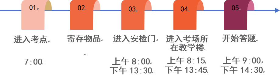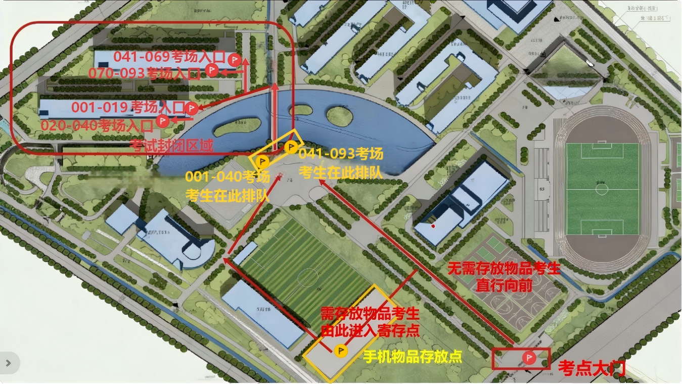 考点重要地点分布 (一)进入考点 上午7:00开放,上午9:15、14:45考点大门关闭,考生不得进入考点。 (二)寄存物品(无需存放可跳过本环节) 考点严禁携带手机等通信工具,如有携带手机、智能手表、智能手环等各种具有发送或者接收信息功能的设备,须服从管理,先将手机等设备按照标识和工作人员引导暂存在本考点指定存放区域集中管理,离场时取回。 存放点内手机物品以考场为单位存放,请考生寄存时快速找到考场服务点,完成寄存后按标识及工作人员引导前往安检门处进行安检。 建议考生仅携带身份证、准考证、考试文具用品和纸质复习资料进入考点,如需寄存请一次性寄存完整,避免因携带不明物品不能通过智能安检门,影响入场。同时小件贵重物品(如项链、戒指)谨慎存放。 (三)智能安检门安检 上午8:00,下午1:30开放安检。安检门通过需要时间,请按指示箭头排队。 所有考生进入考点内的封闭区、警戒区需接受智能安检门安检,安检合格后,方能进入考场封闭区域,继续前往考场。如智能安检门报警,考生应听从安检人员提醒,自查并拿出报警物品集中存放后,再次排队通过智能安检门。 因身体原因,不能进行安全检查的考生(如装有心脏起搏器等),须提供高考体检医院出具的证明,对拒不配合检查的考生,安检人员有权禁止其进入封闭区域或考场,责任由考生自负。 所有离开封闭区域的考生再次进入时都需要重新安检。 (四)进入考场所在封闭区域 考生通过安检门,刷身份证验证后进入考场所在封闭区域。按指示在考场对应入口排队等候。 001-040考场在本考点2号教学楼。 041-093考场在本考点1号教学楼。 (五)进入考场所在教学楼