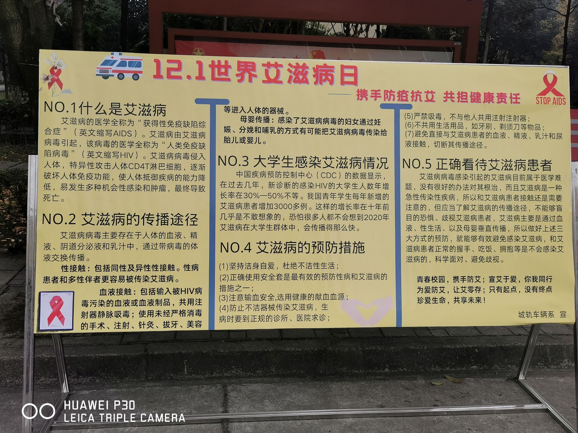 2020 年 12 月 1 日是第 33 个“世界艾滋病日”。为深入贯彻省政府关于全面加强艾滋病防治工作的决策部署和《四川省遏制艾滋病传播实施方案(2019-2022 年)》要求,提高青年学生知艾防艾的自我防护能力,切实保障青年大学生的身心健康,根据学院要求,城轨车辆系从2020年11月20日起,积极组织全系在校共649名学生开展了以“携手防疫抗艾,共担健康责任”为主题的系列宣传教育活动。 本次宣传活动主要以视频、新媒体、知识竞赛、展板宣传等形式,通过线上和线下相结合的方式展开。首先,通过微信公众号在线向广大师生推送了有关艾滋病的宣传文章;其次,2020年11月26日,我系在1311教室组织开展了以“携手防疫抗艾,共担健康责任”为主题的防艾知识竞赛,邀请了我系团总支书记罗希老师、团总支副书记沙孟飞、学生会主席袁钧禹担任评委,有8个班级共24名同学参加本次比赛,比赛按班级划分为8个小组,每组3人。本次比赛总共有4轮,第1轮为必答题,第2轮为抢答题,第3轮为风险题,第4轮为附加题,比赛现场紧张激烈,通过四轮激烈的比赛,最后根据各组评分,城轨20T4凭借优异的表现获得本次比赛的冠军,城轨19T4和城轨20T2分获第二名和第三名,比赛在师生热烈的掌声中圆满结束,通过本次知识竞赛不仅普及了预防艾滋病相关知识,而且增强了同学们抵御艾滋病的意识;最后,2020年12月1日,各班开展了“携手防疫抗艾,共担健康责任”主题班会,组织学习了艾滋病的传播途径、预防措施及消除对艾滋病患者的歧视与偏见等内容,并用实例说明了艾滋病对人们身心健康带来的危害,引起了同学们对艾滋病防治的重视。 通过开展主题班会、微信公众号推文、制作宣传展板等多种形式,多渠道、全方位向同学们普及了艾滋病知识,提高了大学生对艾滋病的了解和防范意识,促进学生健康成长,有利于学生行动起来,携手防艾,宣艾于爱,为爱防艾,让艾零存,珍爱生命,共担责任,共享未来!
