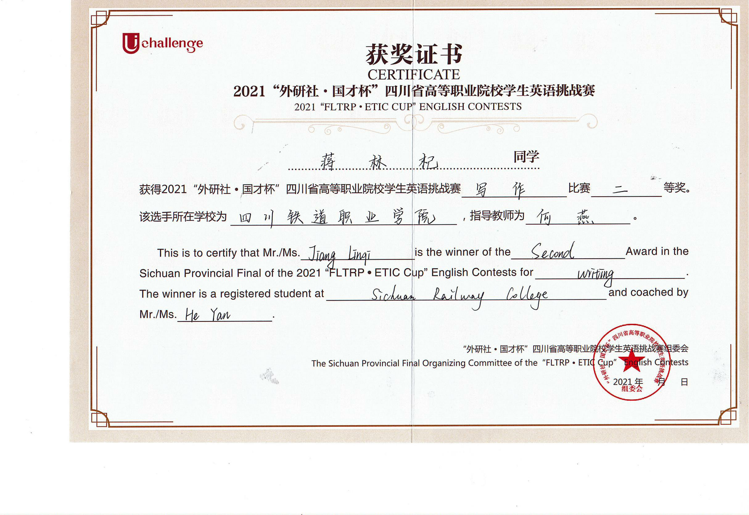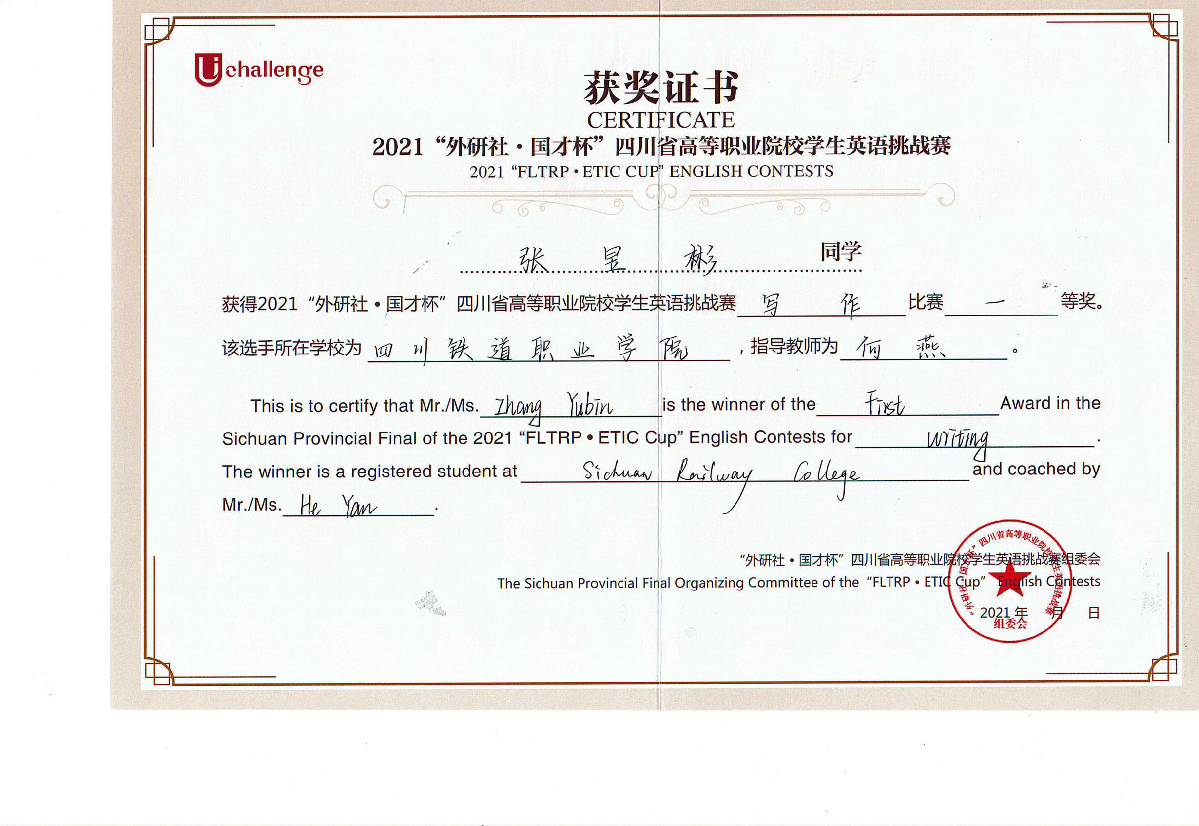 2021年10月30日至31日,由四川省教育厅主办,四川文化产业职业学院、外语教学与研究出版社承办的2021年UChallenge四川省高等职业院校学生英语挑战赛在四川文化产业职业学院隆重举行。经过激烈角逐,伟德国际铁道机车运用与维护21T1张昱彬获得写作大赛一等奖,铁道信号自动控制21T1蒋林杞获得写作大赛二等奖,铁道信号18A1杨婧彤获得演讲比赛三等奖。 本次大赛汇聚了四川省63所高等职业院校的209名选手参加比赛,由英语演讲和英语写作两项赛事组成,以高远的立意和创新的理念,全面提升高职学生的英语综合应用能力。赛前,公共教学部英语教研室何燕、叶莎两位老师分别作为写作指导教师和演讲指导教师,对选拔出的参赛选手进行了专业而细致的指导培训,积极做好竞赛的筹备工作。比赛过程中,伟德国际学生凭着扎实的英文基础和坚持不懈的刻苦训练,以出色的文笔、清晰的逻辑和流利的表达获得优异成绩。 此次比赛,促进了伟德国际与其他高职院校之间的交流,展现了伟德国际学生的风采,为全校英语教学增添了丰富的形式。以赛促教、以赛促改,拓宽了教学改革渠道,提高了英语教学工作质量,促进了复合型技术技能人才的培养。 张昱彬(右三)荣获写作一等奖 蒋林杞(正中间)荣获写作二等奖 杨婧彤(正中间)荣获演讲三等奖 |