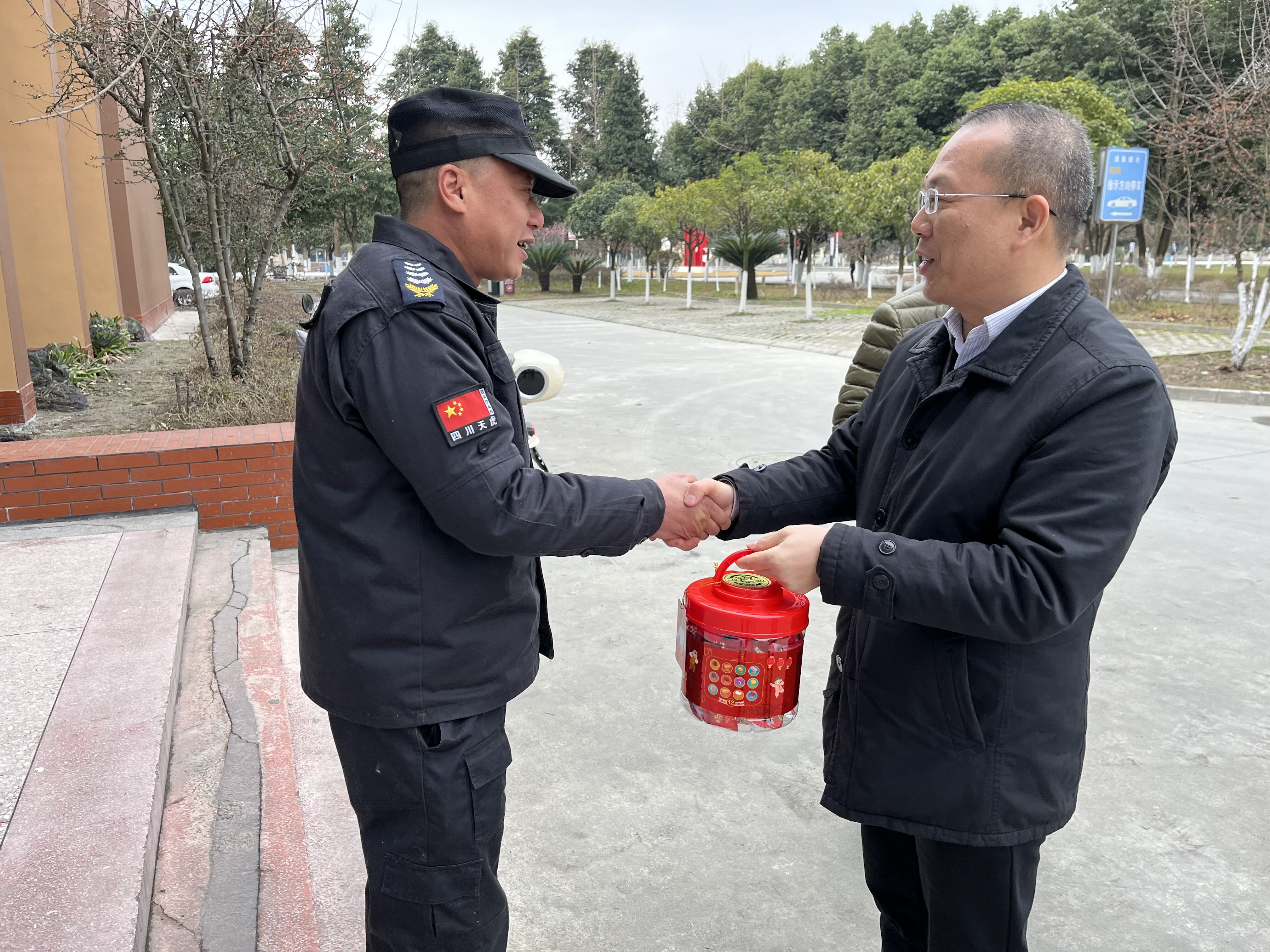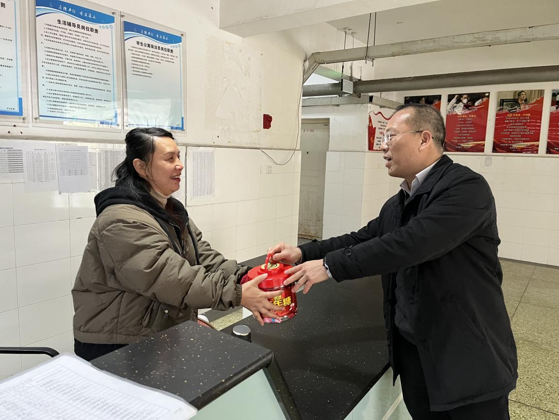 1月31日,农历除夕,学校党委书记贺兆轩同志带队对值班人员和留校学生进行了慰问,党委办公室/学院办公室/外事办公室、党委学生工作部/学生处/就业处、后勤国资处、安全保卫处相关人员参加慰问。 贺兆轩同志对在万家团聚的日子为了学校安全、后勤保障仍然坚守岗位的值班人员表示感谢,并代表学校向节日期间仍然在工作岗位的全体干部职工及家人拜年。