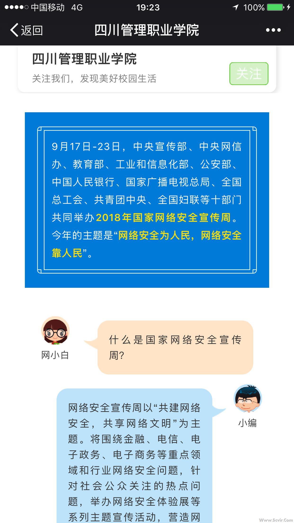 9月17日-23日是第五个国家网络安全宣传周。学院紧扣今年宣传周“网络安全为人民,网络安全靠人民”的主题,统一协调多个部门,采用线上线下结合、校内校外联动的形式,组织动员师生广泛参与,助力营造健康文明的校园网络环境。 9月17日起,思政部、图书信息中心、院团委、学生处、各系部联动,利用网络平台开展了形式丰富,实用性强的网络安全教育宣传活动。学院官网主页设专题网站,学校微博和微信公众号发布相关主题新闻,校园内悬挂宣传横幅、摆放宣传板,帮助师生提升网络安全意识和防护技能。 同时,学院也组织了多场线下宣讲活动。17日,邀请了“四川省警察散打评书第一人”——郫都区公安分局宣传民警耿琦警官做“网络安全教育”专题报告。百余名师生代表参与了讲座,现场学习氛围十分浓厚。17、18日,各系团总支组织开展了形式活泼、内容丰富的网络文化活动,宣传网络安全知识,教育引导学生的网络行为。19日,由思政部龙燕老师、校团委张乃文老师带队,共计46名学生代表前往成都世纪城新国际会展中心参观了网络安全博览会,近距离体验网络安全。 此次网络安全周系列活动,进一步巩固了全体师生的网络安全维护意识,积极推动形成人人重视网络安全、传播网络空间正能量的校园氛围。