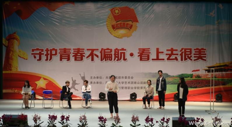 为进一步加强大学生安全教育工作,增强对非法校园贷、兼职陷阱、传销、诈骗等问题的鉴别能力,提升大学生的自我保护意识和维权能力,由共青团成都市委员会主办,四川师范大学艺术团南山话剧社、共青团四川管理职业学院委员会承办的话剧《守护青春不偏航——看上去很美》于2018年3月14日19:00在我院大礼堂演出,全院师生共1200余人观看了演出。 四川师范大学艺术团南山话剧社以当代大学生 “四防”为主题,通过生动形象的表演,讲述了主人公大学生温娇与小矾面对网贷、兼职、诈骗、传销等骗局时,如何保护自身权益并在挫折中成长的故事。当今各类骗局对于大学生诱惑力极强,缺乏自控能力、消费欲望强烈或有创业资金需求的大学生尤其容易上当受骗。演员们用诙谐幽默的表演引得台下众人欢笑声与掌声不断,在轻松的氛围中教会大家当遭遇骗局时应如何巧妙应对,现场观众获益匪浅。 共青团成都市委权益部部长姚明达同志,郫都区司法局安德司法所所长陈文同志,四川师范大学团委李凯同志,四川现代职业学院团委书记周文同志,四川管理职业学院党委委员、副院长易刚同志出席了本次活动。演出前,易刚同志发表讲话,希望同学们学会增强风险防范意识,学会保护自己。姚明达同志号召同学们积极参与到自护系列衍生作品创作的活动中。 本次演出旨在帮助同学们认识身边潜在的危机,增强风险防范意识和法律意识,警示自我,培养自身全面思考能力,为创建平安校园和维护社会稳定打下坚实基础。