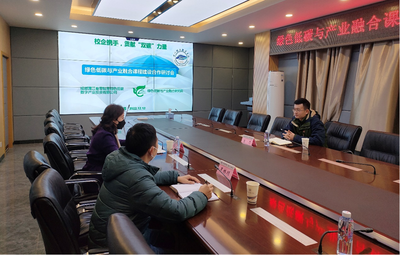 赖芳校长对孟经理的到来表示了欢迎,并介绍了学校的办学定位、办学思路、历史积淀和研究院研究方向。她说到学校根植轨道交通行业,培养具备绿色发展理念、德智体美劳全面发展高素质技术技能型人才的目标不会改变。希望学校、研究院可以和企业深入合作,共谋生态环境高质量发展。同时希望平台成员在合作中,提升自己科研素养,提升教育和科研服务能力。 孟亮经理首先介绍了公司基本情况。公司是浦江政府产业金融平台,是碳体系认证机构授权服务单位,以“低碳数字投资”为核心目标,向管理部门提供碳达峰碳中和规划服务,向社会各界提供节能减排信息服务,为生产企业培养“双碳”专业人才。孟经理提出公司业务与学校绿色低碳与产业融合研究院的业务范围非常契合,希望能与学校加强沟通与交流,找到合作链接点,携手为“3060”碳达峰碳中和贡献力量。