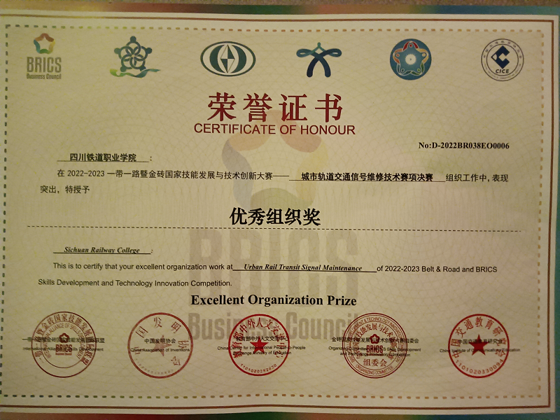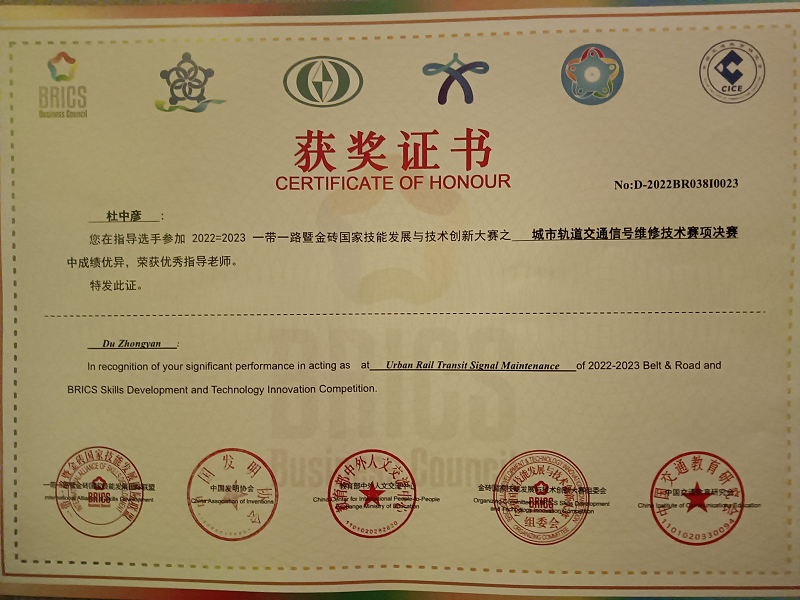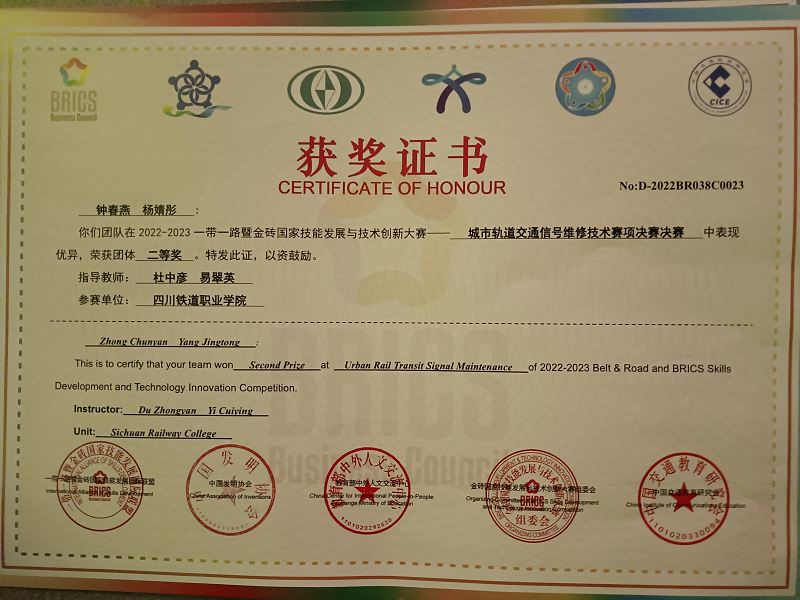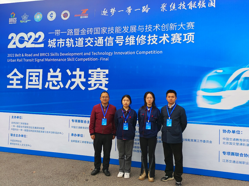 2023年4月22日,2022一带一路暨金砖国家技能发展与技术创新大赛城市轨道交通信号维修技术赛项总决赛在南京交通职业技术学院盛大开幕。电信工程学院信号18A1班杨婧彤、信号20T1班钟春燕,获全国二等奖,指导教师杜中彦、易翠英荣获优秀指导教师奖,学校荣获优秀组织奖。 本次竞赛经历了省赛选拔,国赛考核,紧紧围绕城市轨道交通信号工职业岗位的核心能力培训与考核。考核分为两个部分,理论考试根据职业技能标准开展命题考核,技能实操考核高度还原标准化维修作业流程,检验参赛选手信号设备检修、信号设备故障分析与处理的技能操作水平。 此次竞赛,增进了伟德国际与其他参赛各院校之间的友好交流,了解了信号行业的发展新趋势、新技术,切实达到“以赛促教、以赛促学、以赛促改、以赛促建”的目的。同时,在技能竞赛的激励下,提高了学生学习专业的兴趣和实践操作能力,提高了专业建设水平和人才培养质量。
