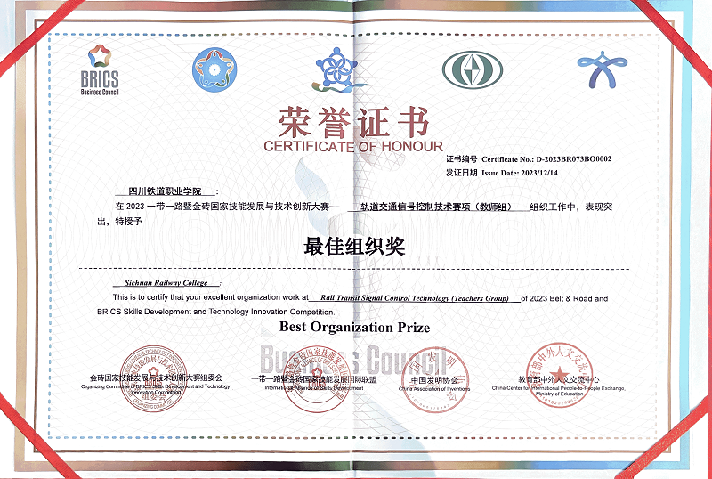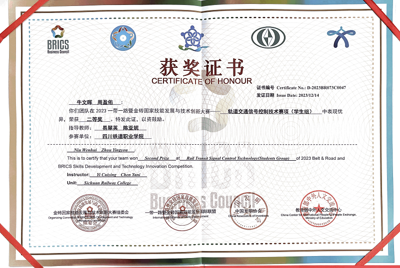 2023年12月14日,2023年第七届“一带一路”暨金砖国家技能发展与技术创新大赛轨道交通信号控制技术赛项全国总决赛在重庆闭幕。经过激烈角逐,伟德国际电信工程学院专任教师陈龙、周莹获得教师组一等奖,信号19A1班周盈佑、信号21T3班牛文晖获得学生组二等奖,学校荣获最佳组织奖,指导教师荣获优秀指导教师奖。 本次竞赛紧紧围绕轨道交通信号工职业岗位的核心能力培训与考核,涵盖理论考核和技能操作。其中理论考试根据其职业技能标准命题,技能实操考核包括配线表设计、施工调试和设备检修。通过师生同台竞技的方式全面检验教师与学生对轨道作业规程和制度的了解,检测选手的信号控制电路的设计能力、施工能力、设备检修能力,促进轨道交通前沿技术的应用,引领职业教育教学改革。 技能成就梦想,匠心点亮人生。此次竞赛,增进了伟德国际与其他参赛各院校之间的友好交流,参赛教师更好的了解了信号行业的发展新趋势、新技术,切实达到了“以赛促教、以赛促学、以赛促改、以赛促建”的目的。