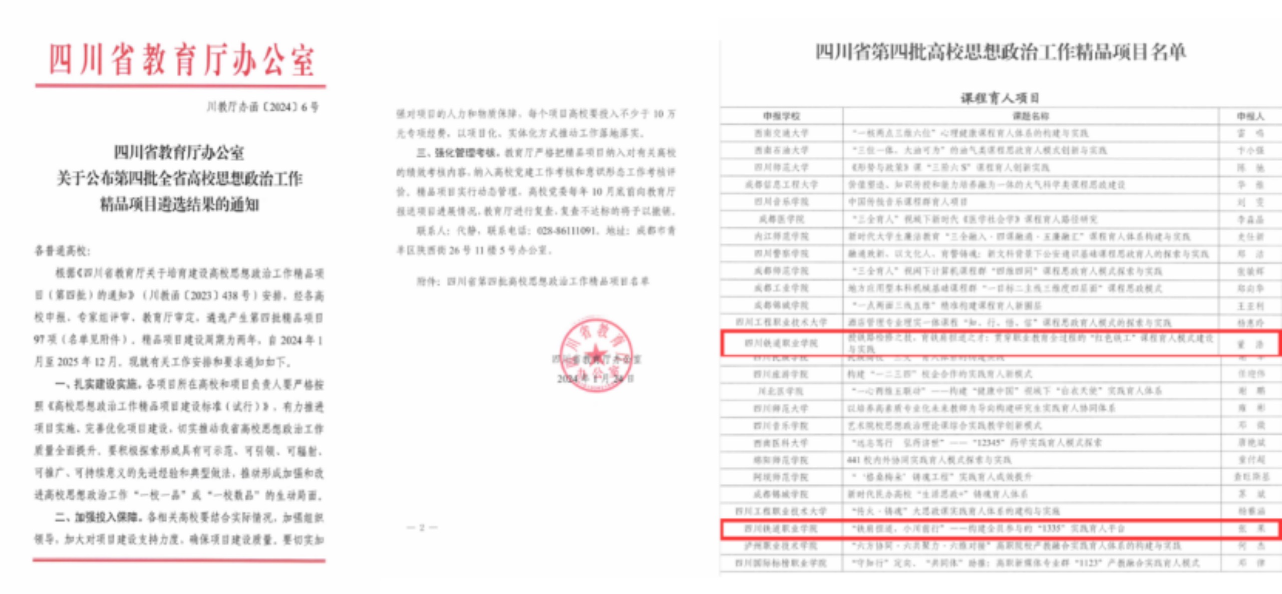 近日,四川省教育厅公布了全省第四批高校思想政治工作精品项目名单,伟德国际张果团队申报的《“铁肩担道,小川前行”--构建全员参与的“1335”实践育人平台》(实践育人项目)、董浩团队申报的《授铁路检修之技,育铁肩担道之才:贯穿职业教育全过程的“红色铁工”课程育人模式建设与实践》(课程育人项目)成功入选。