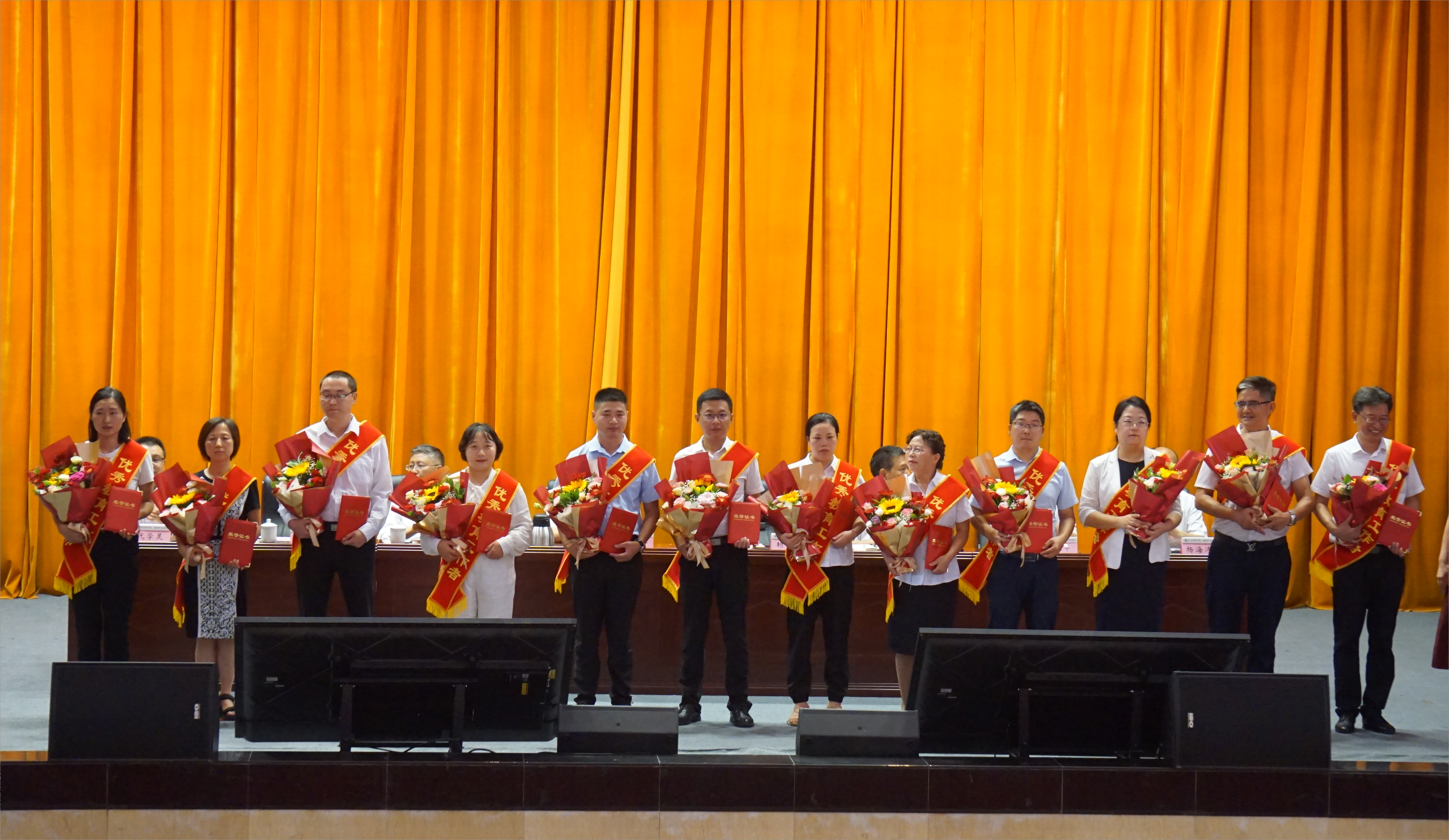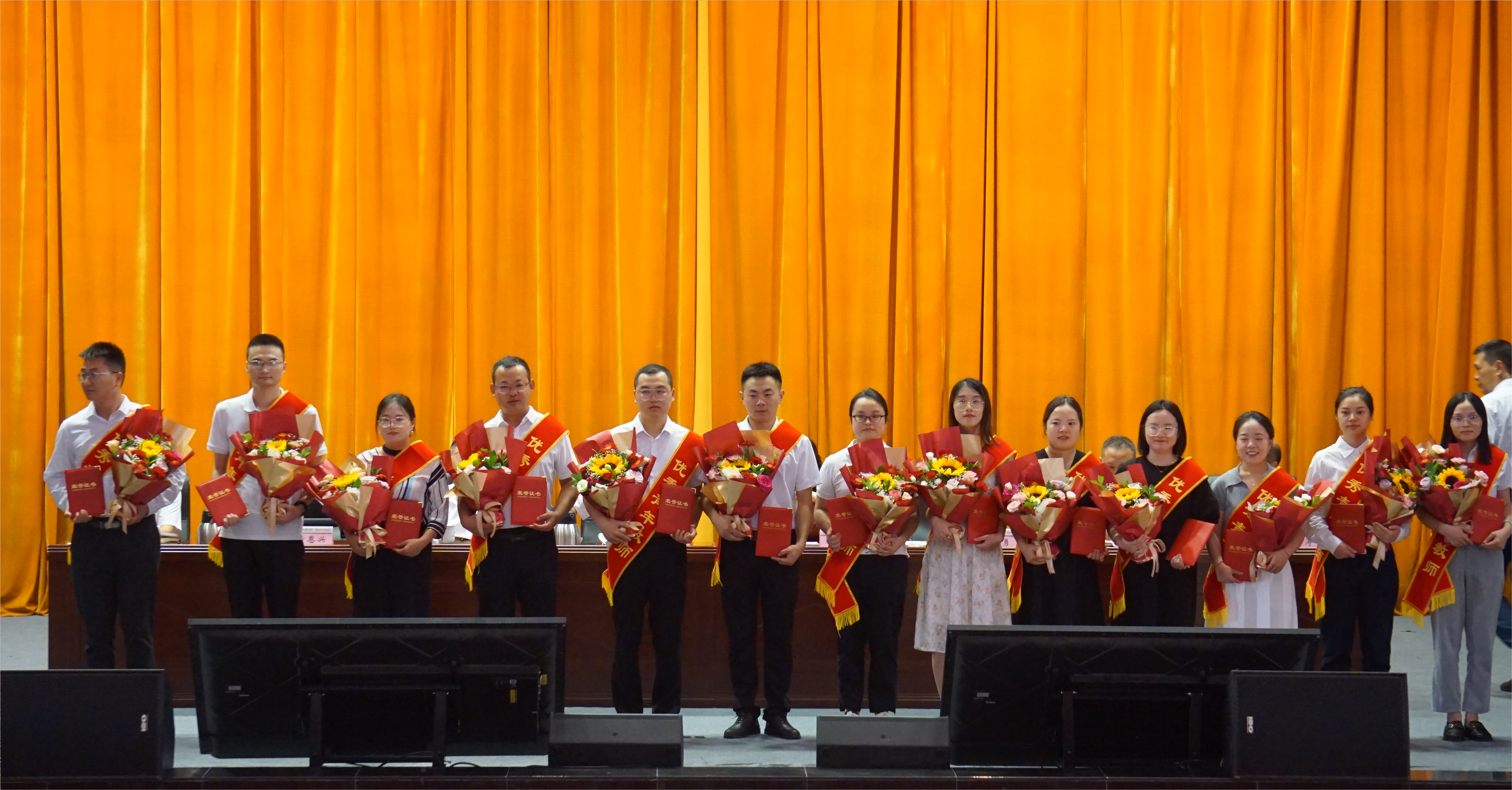 随着庄严的国歌声响起,庆祝大会正式拉开帷幕。黄恩兴宣读了2024年优秀个人表彰决定等表彰文件,102名优秀个人和27名近两年来在教学、科研、竞赛等方面取得标志性成果的团队和个人代表先后上台接受表彰,学校领导为他们颁奖。学生代表向全体教师献词朗诵,感谢老师们的默默付出和无私奉献。匠心独运的《岁月如歌 师道永恒》沙画演绎呈现了学校坚苦卓绝的奋斗历程和老师们潜心教书育人的辛勤付出。