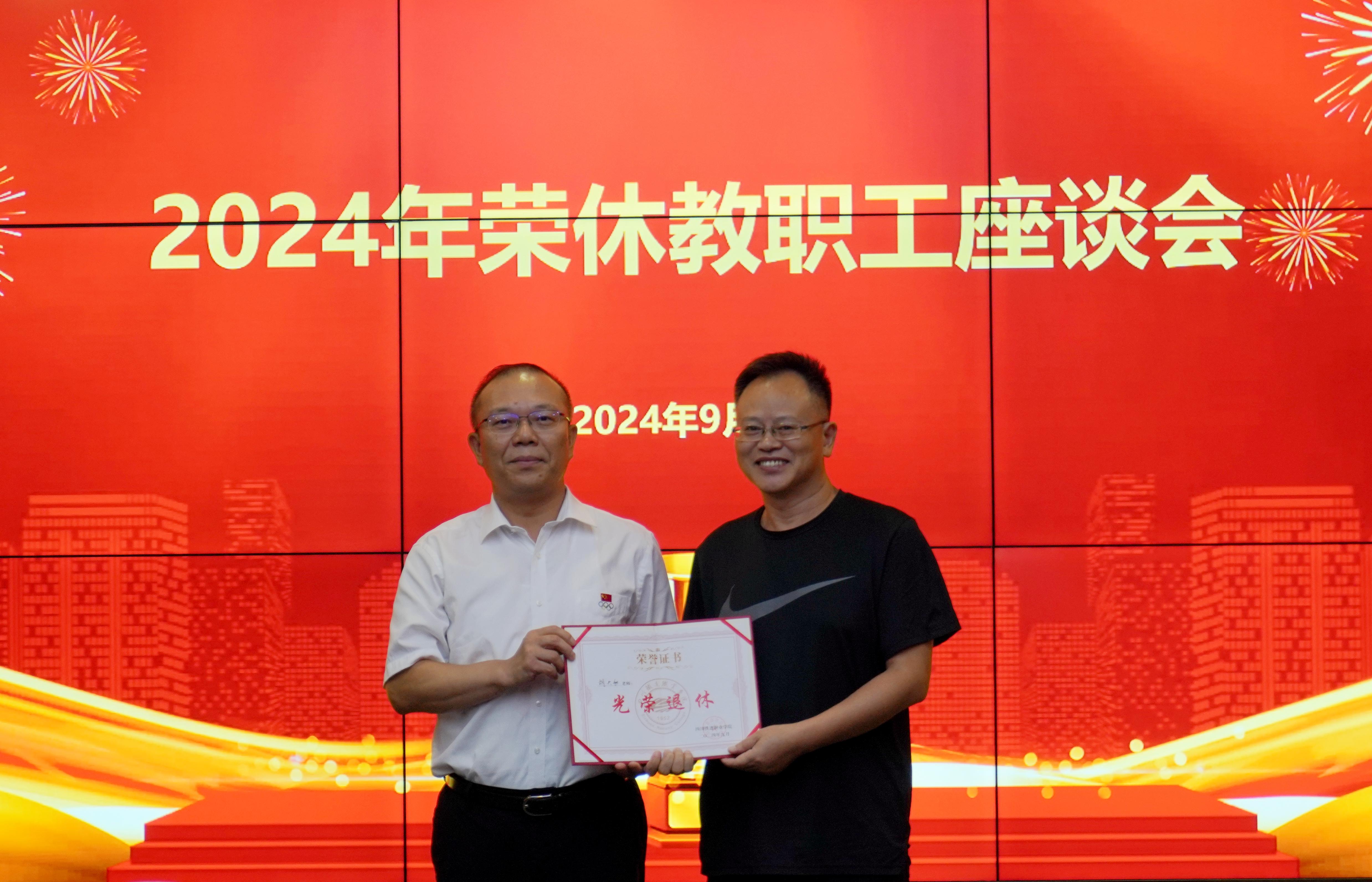 贺兆轩代表学校党委向全体荣休教职工颁发“光荣退休”证书,充分肯定了荣休教职工多年以来对学校的贡献和深厚情谊,学校发展至今,离不开一代代教职工默默付出和无私奉献,以招生线显著提高等成绩为例,向荣休教职工展示学校正在蓬勃发展,希望全体荣休教职工离岗不离心,继续关心、关注和支持学校事业发展,继续发扬吃苦耐劳、艰苦奋斗的高尚品质,共同为川铁职院的发展添砖加瓦,祝愿老同志们平安喜乐,退休生活愉快!