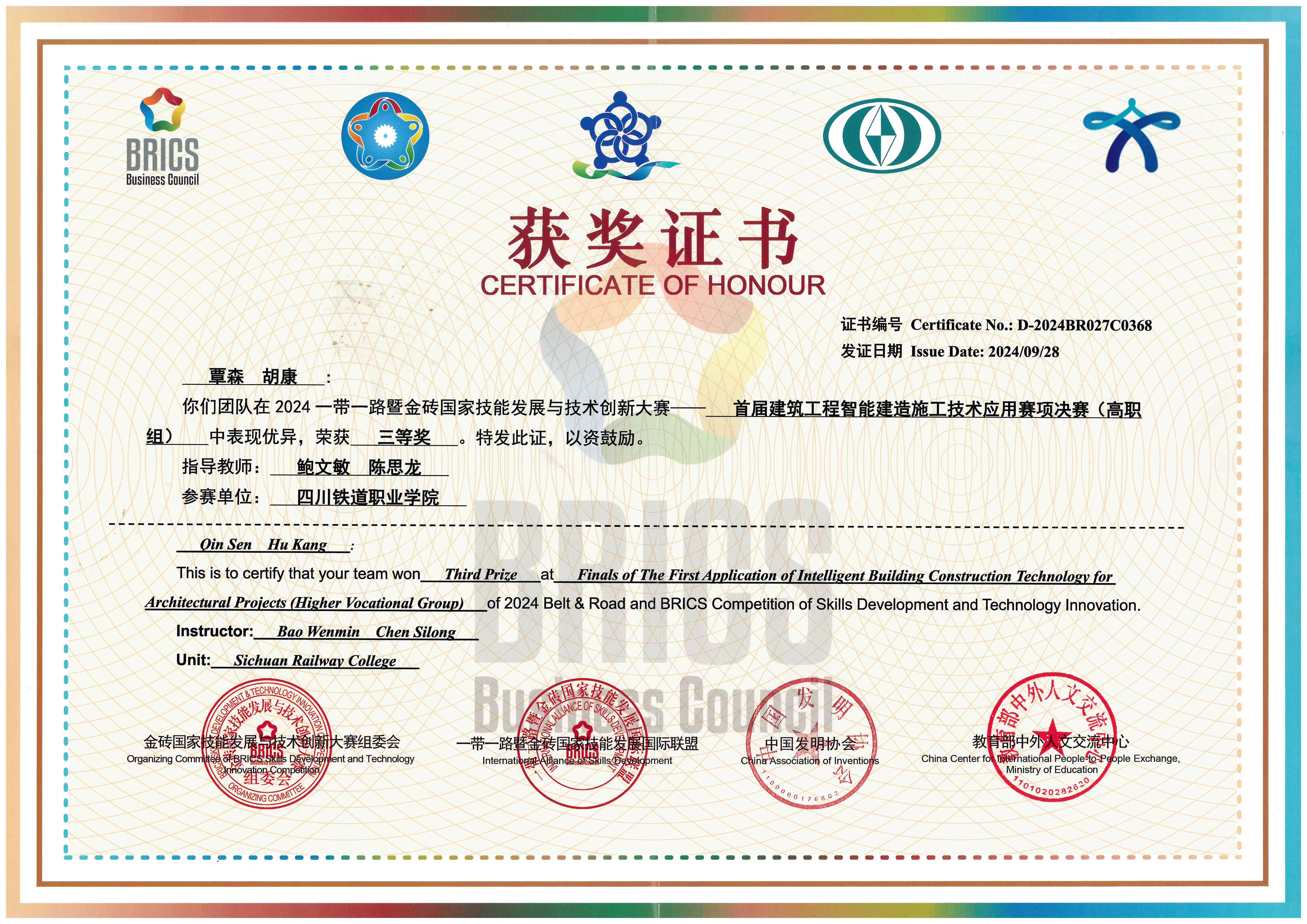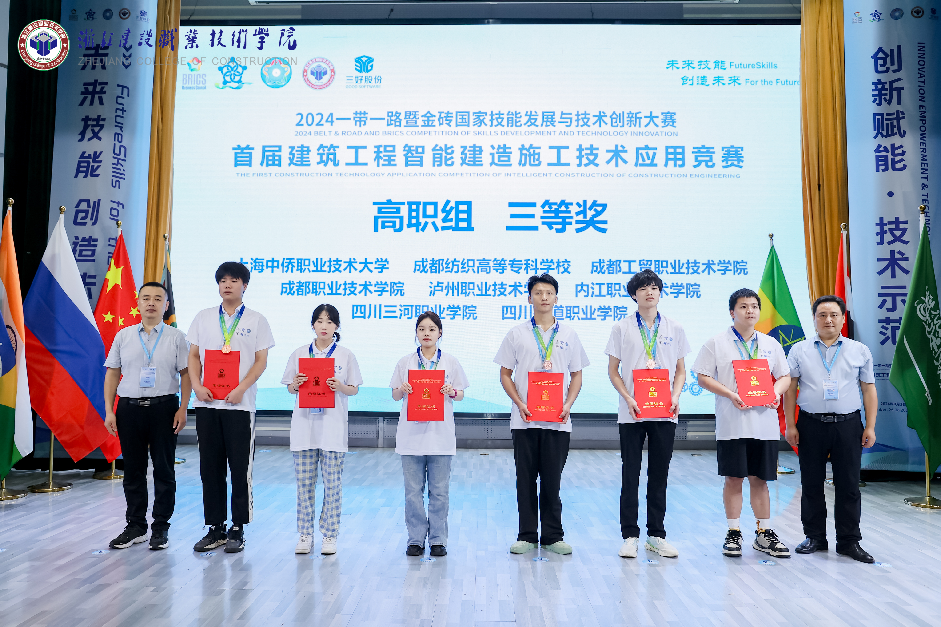 2024年9月26至28日,2024一带一路暨金砖国家技能发展与技术创新大赛首届建筑工程智能建造施工技术应用赛项(BRICS-ST-027)全国总决赛在浙江杭州举行。学校铁道工电学院覃森、胡康学生团队荣获全国总决赛三等奖。 一带一路暨金砖国家技能发展与技术创新大赛是经金砖国家最高领导人会晤筹备委员会认可、中华人民共和国外交部备案、金砖国家工商理事会批准的国际大赛。大赛主要以智能制造、先进制造等技能为核心,关注未来技能人才培养,是推动金砖国家间教育合作、技能开发和人文交流活动的重要平台。建筑工程智能建造施工技术应用赛项以建筑工程施工前沿技术技能应用为主题,结合“双碳”目标与产业绿色转型发展趋势,综合考察选手的建筑施工技术、创新实践等能力。此次全国总决赛汇聚了来自全国超过200所院校的282支精英队伍,他们围绕智能建造技术、建筑工程碳计算等应用与实践领域进行技术交流切磋、激烈对决。伟德国际参赛队伍凭借卓越的创新思维和精湛的技术实力荣获全国三等奖。