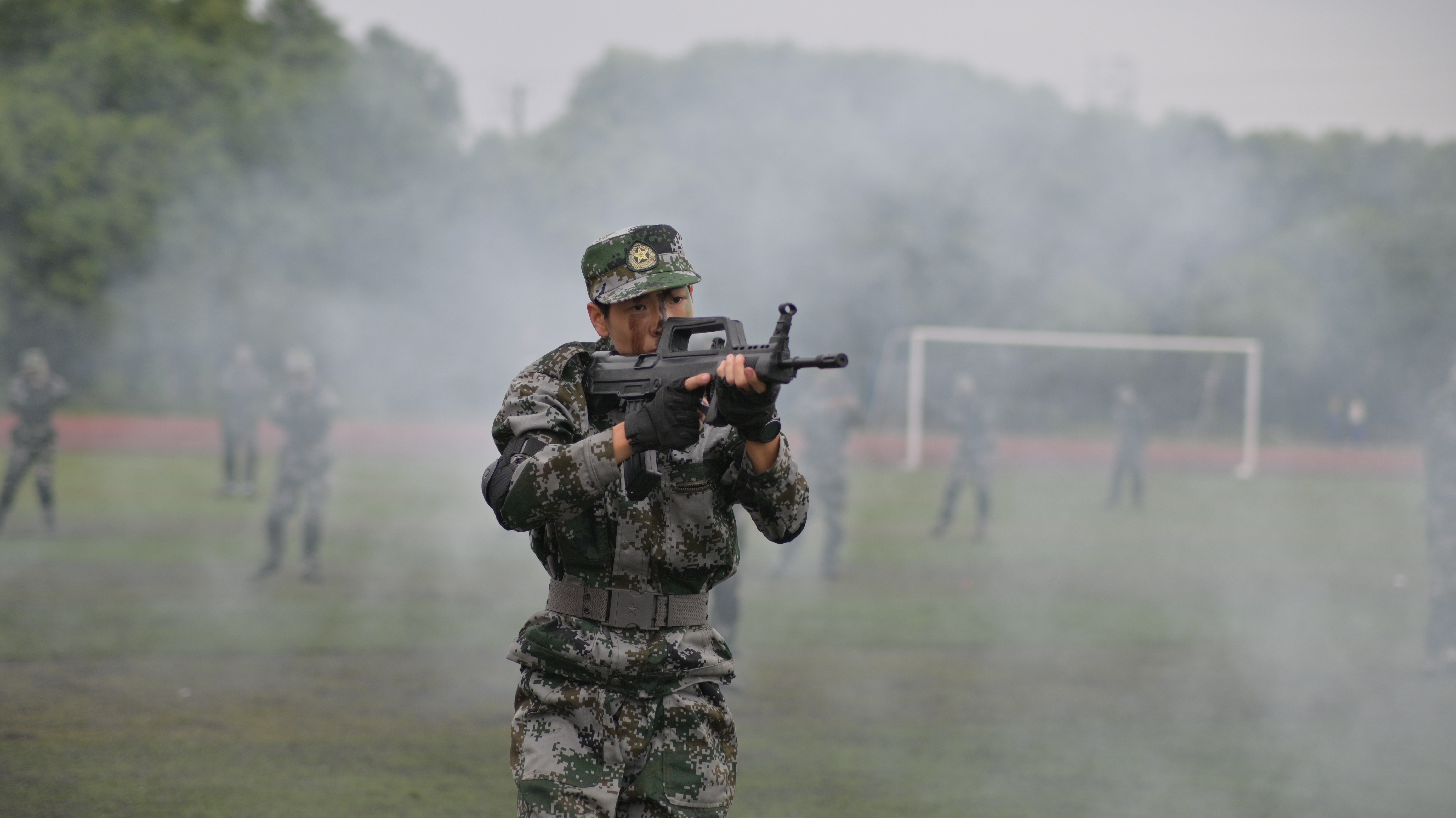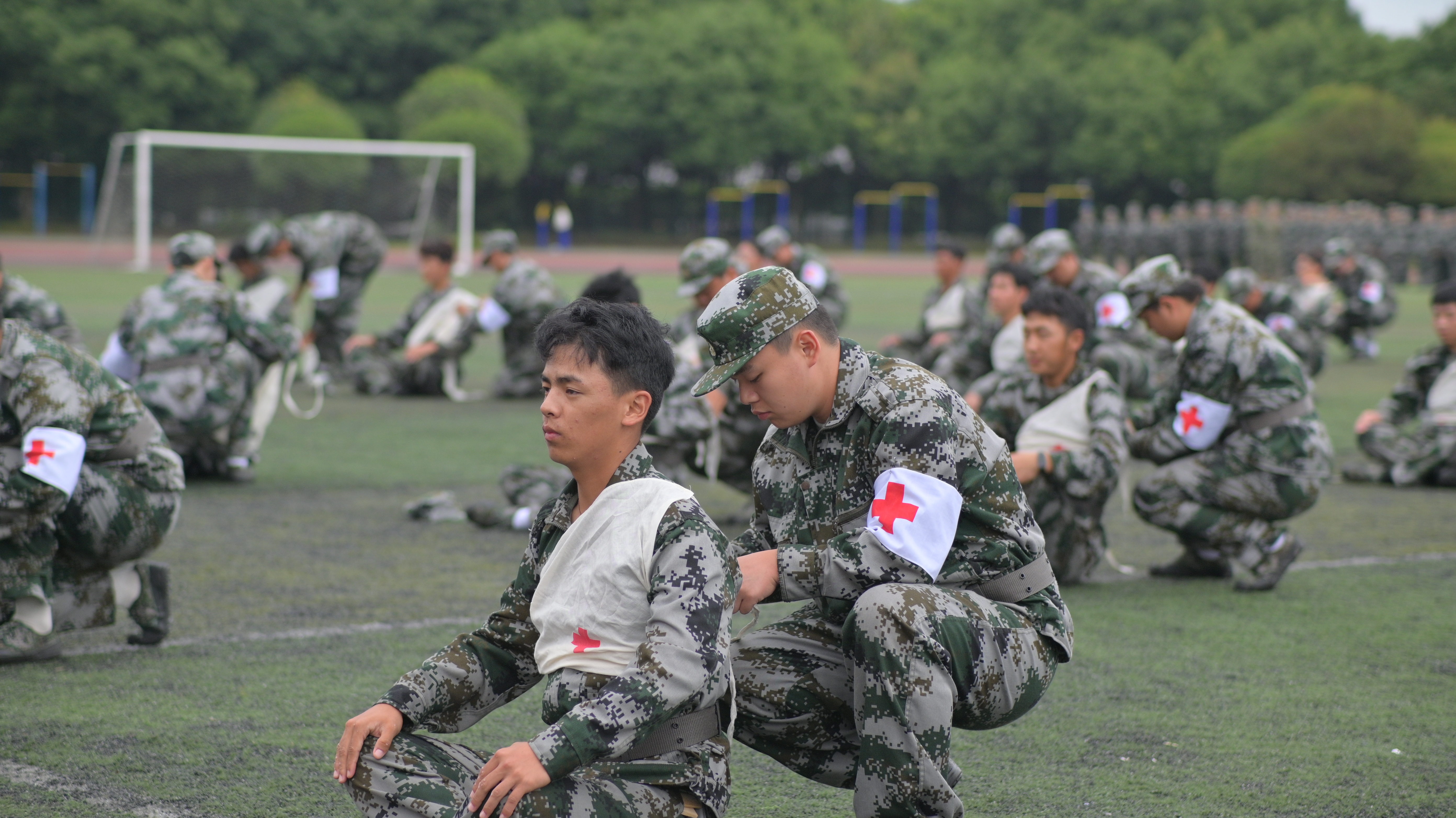 军训成果汇报中,各新生方阵步伐整齐划一、铿锵有力,依次通过主席台接受检阅。同学们精神抖擞,口号嘹亮,眼神坚毅,英姿飒爽,充分展现了川铁学子昂扬向上的精神风貌和军训淬炼的优良作风。在单项科目汇报环节,匕首操、棍术、军体拳、擒敌拳、战场救护、战术队形等表演轮番上演,同学们动作精准,气势如虹,尽显青春热血与迷彩荣光。