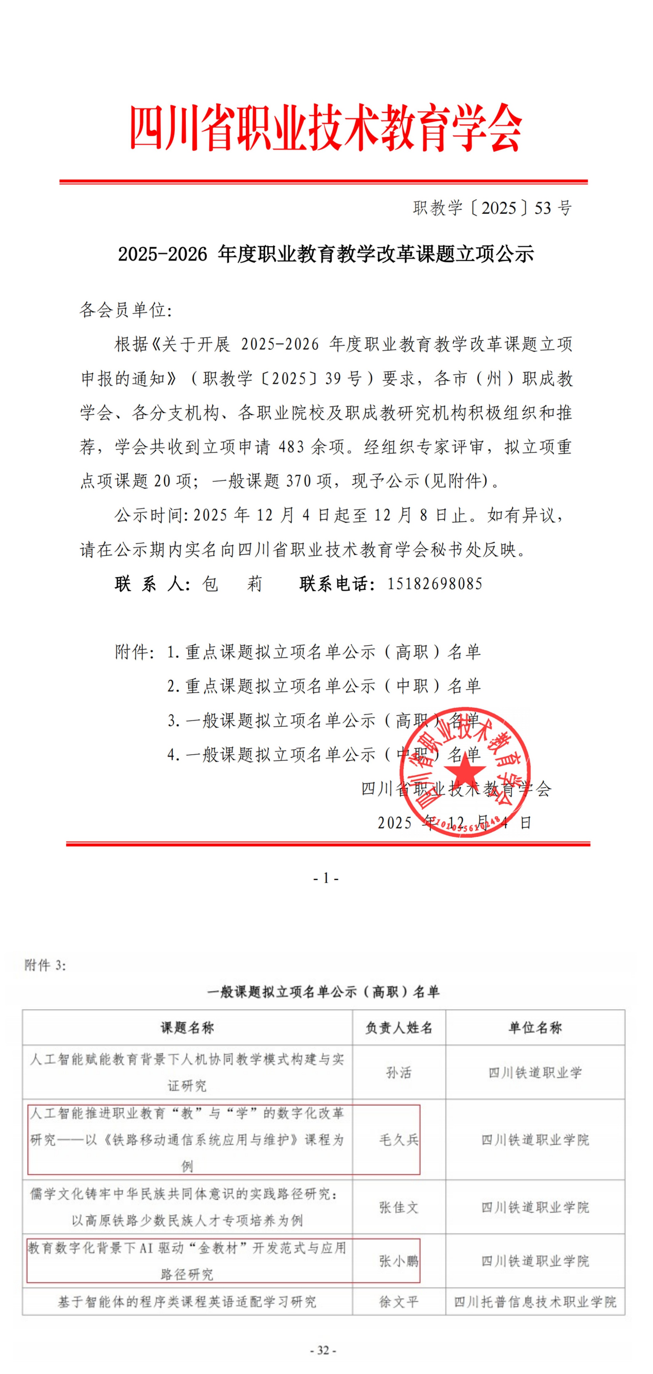 12月4日,四川省职业技术教育学会公示2025-2026年度职业教育教学改革课题立项名单,伟德国际电信工程学院两项课题成功入选。 毛久兵老师负责的《人工智能推进职业教育“教”与“学”的数字化改革研究--以〈铁路移动通信系统应用与维护〉课程为例》课题,以铁道通信专业核心课程《铁路移动通信系统应用与维护》为具体研究载体,研究如何通过AI技术重构“教”与“学”活动,探究AI在职业教育“教”与“学”全流程中的应用路径,推动教学数字化改革。张小鹏老师负责的《教育数字化背景下AI驱动“金教材”开发范式与应用路径研究》课题,以AI技术为核心构建“金教材”开发范式,推动教材从静态知识载体向智能学习伙伴转型。