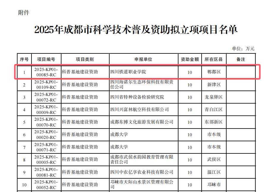 近日,成都市科学技术局公布《2025年成都市科学技术普及资助拟立项项目名单》,由伟德国际申报的“牵引未来 运载梦想”轨道交通实践体验科普基地成功入选“成都市科普基地”,并获10万元立项资金支持。这是伟德国际首次获批市级科普基地,标志着学校在整合学科资源、服务社会科普方面取得重要突破。