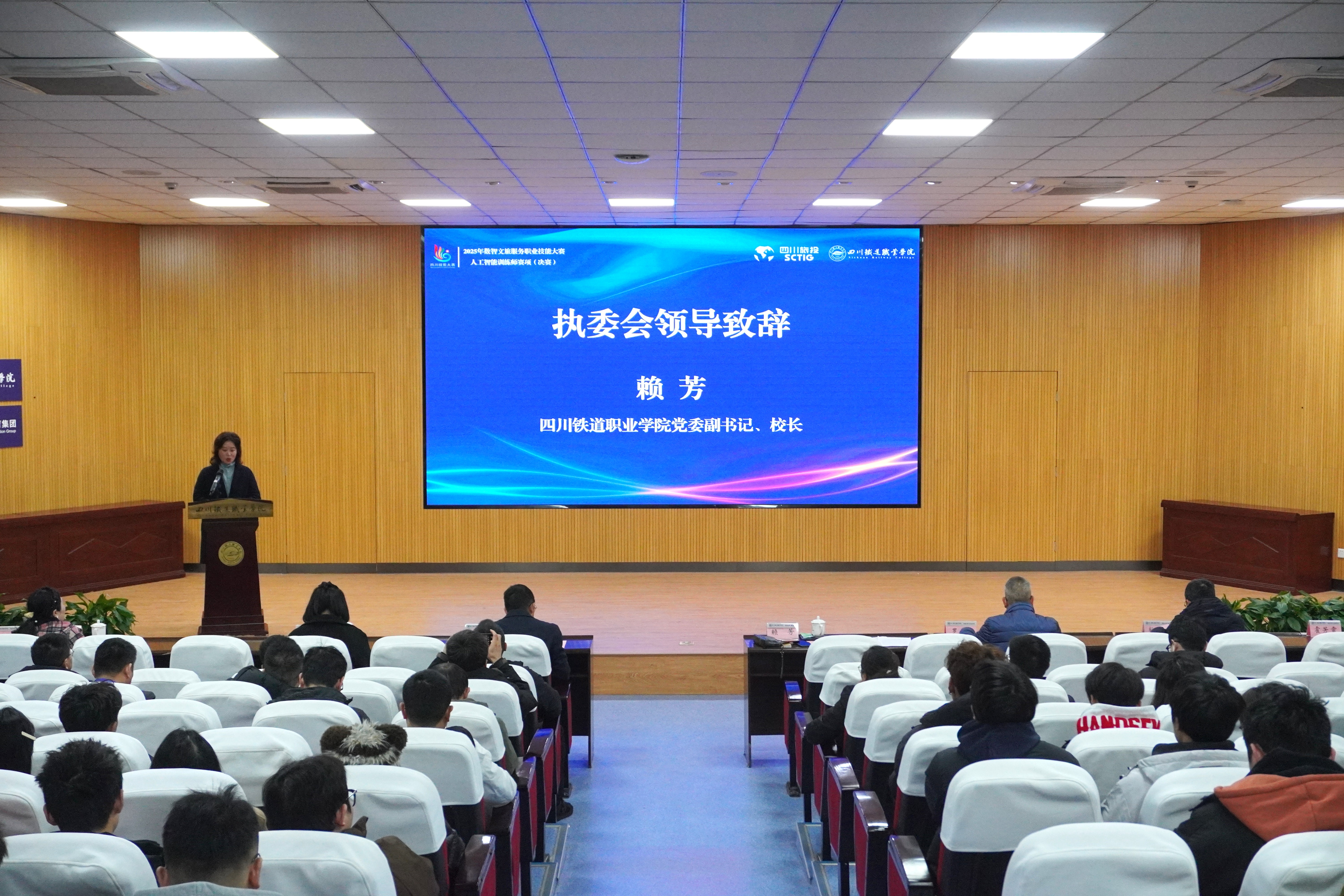 赖芳代表赛事执委会致辞,介绍了学校近年来在轨道交通领域深耕人工智能应用、培育“数字铁道工匠”的办学成果。她表示,学校将全力以赴做好赛事组织与服务保障工作,坚持公平、公正、公开原则,确保大赛安全、有序、高效开展。