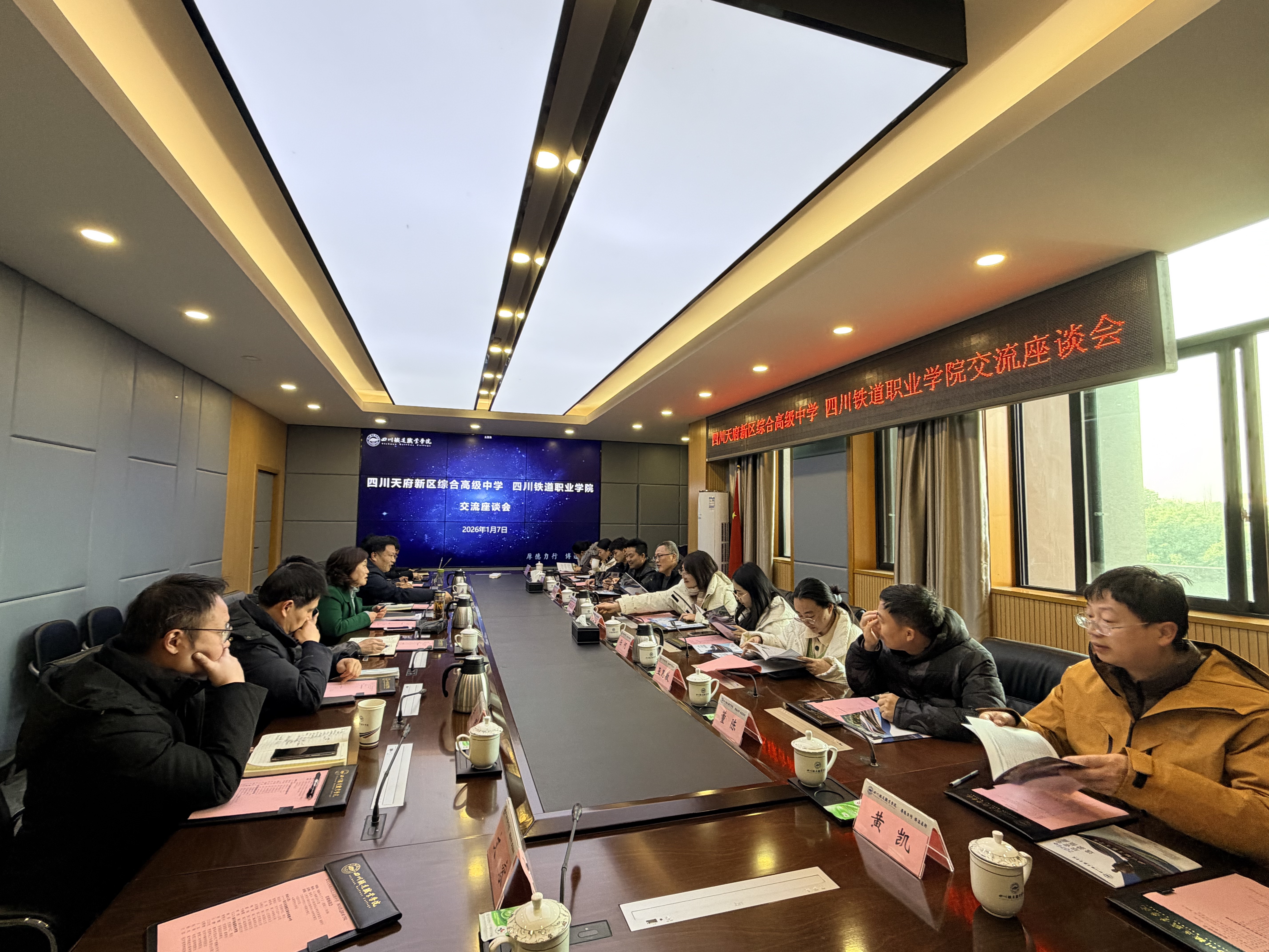 1月7日,四川天府新区综合高级中学党委副书记、校长胡友洲一行到校调研交流。校长赖芳、副校长黄恩兴出席座谈会,双方围绕专业建设、产教融合、招生就业等核心议题深入探讨,共商校校合作机制,携手推进职业教育高质量发展。 座谈会上,黄恩兴介绍了学校办学历程、专业布局及办学特色,重点分享了学校在产教深度融合、学生核心素养培育、招生就业联动机制等方面的创新实践与显著成效。胡友洲结合天府新区综合高级中学的创办背景、发展定位及“普职融通、多元育人”的办学路径,详细阐述了其在课程融合、教学改革和协同育人方面的探索成果。他表示,两校文化底蕴深厚、育人理念相通,在文化浸润、校企协同、职业启蒙等方面具有高度契合点,期待未来在人才联合培养、科研协作、研学实践及职业体验项目等领域深化合作,实现资源共享、优势互补、互利共赢。