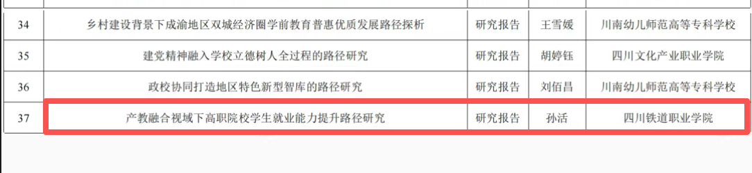 近日,四川高等职业教育研究中心公布了第四届职业教育研究优秀成果评奖结果。伟德国际机车车辆学院教师孙活、张永昂主持的《产教融合视域下高职院校学生就业能力提升路径研究》研究成果,从众多优秀成果中脱颖而出,荣获四川高等职业教育研究中心第四届职业教育研究优秀成果奖三等奖。
