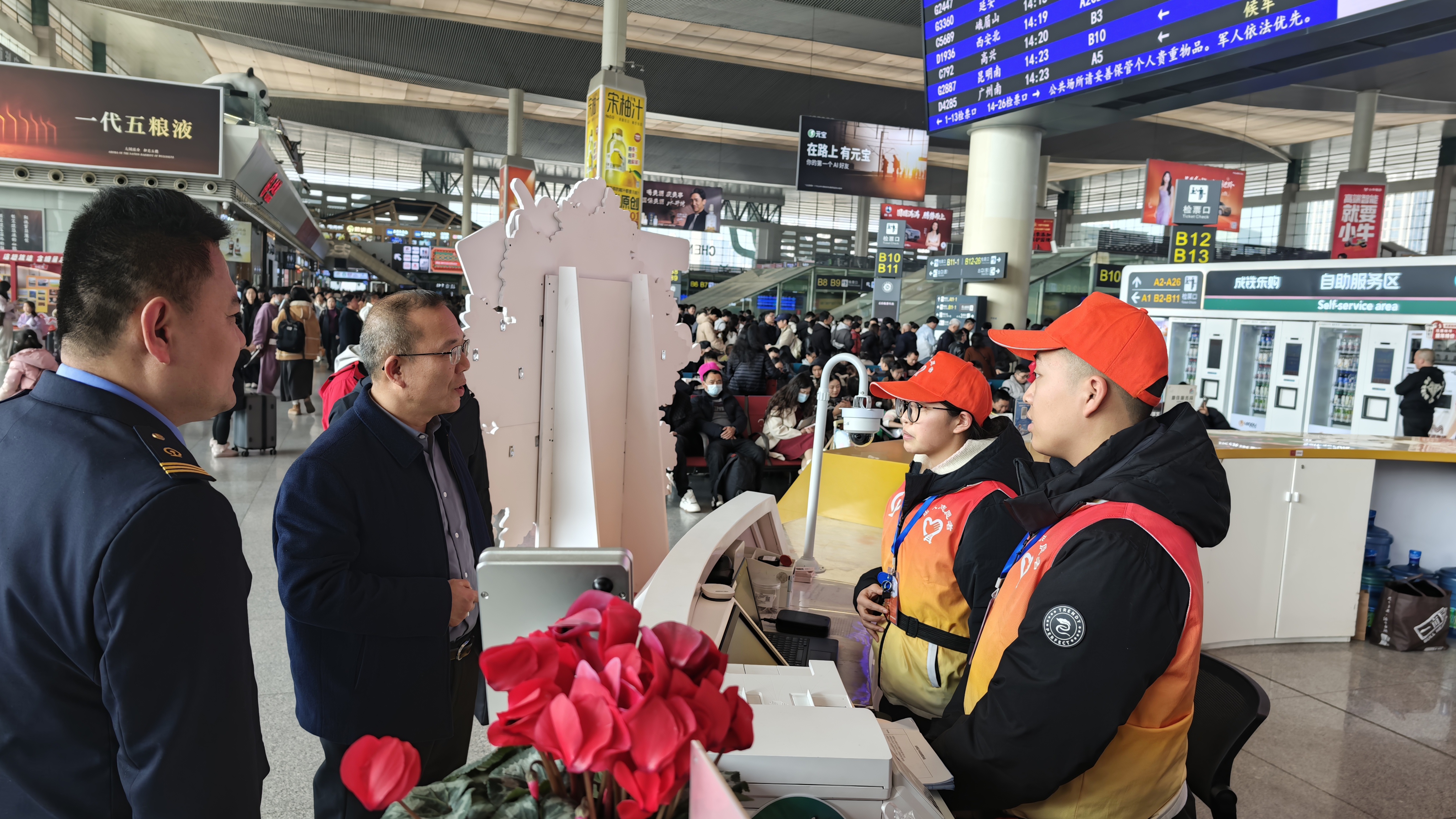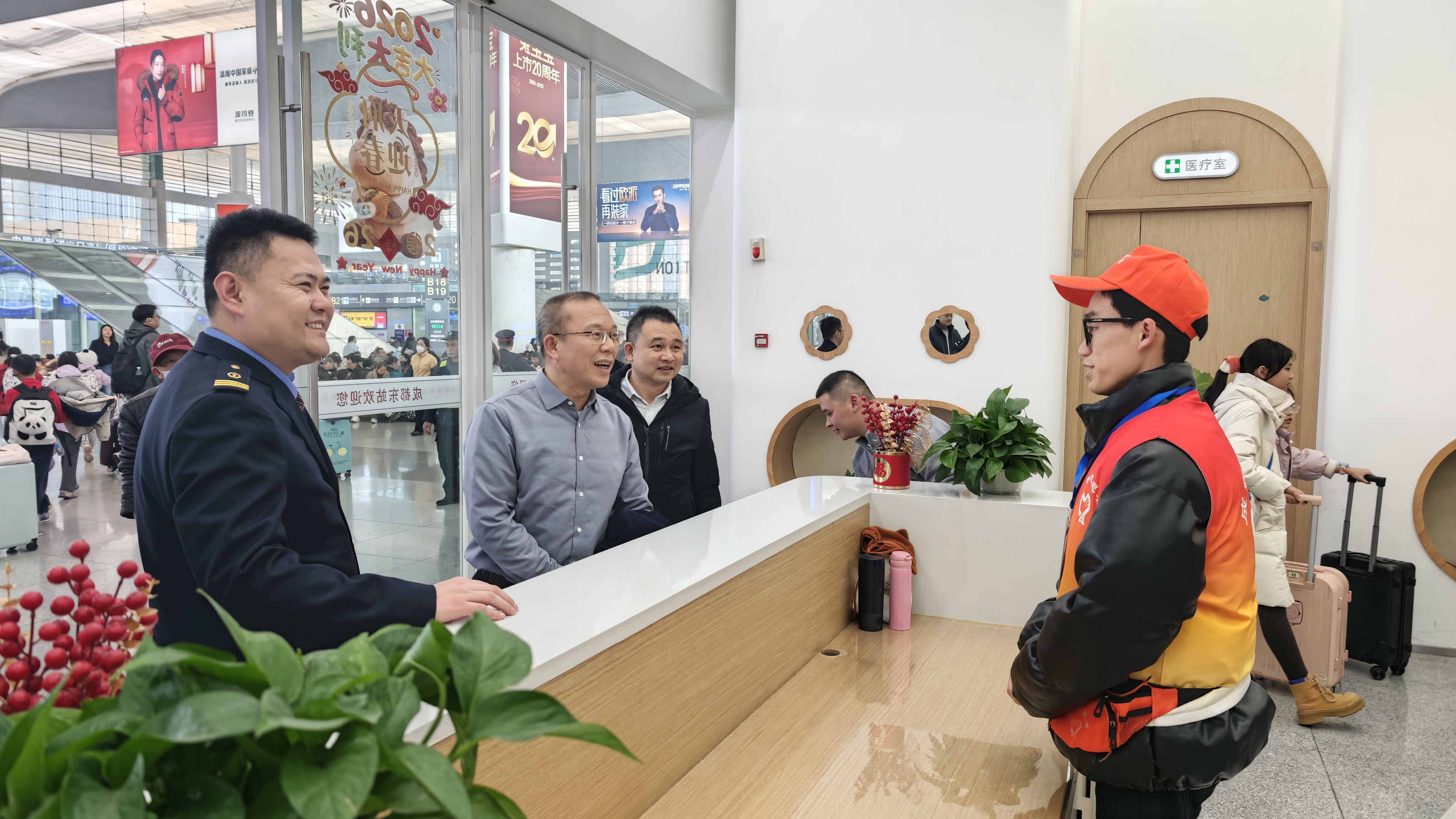 在成都东站,贺兆轩与同学们亲切交流,了解他们的工作、生活情况,并代表学校向坚守在春运一线的志愿者们致以诚挚的慰问,勉励大家继续发扬“奉献、友爱、互助、进步”的志愿服务精神,在实践中坚定理想信念,锤炼过硬本领,用青春力量助力铁路春运,进一步擦亮“铁小川”志愿服务品牌。