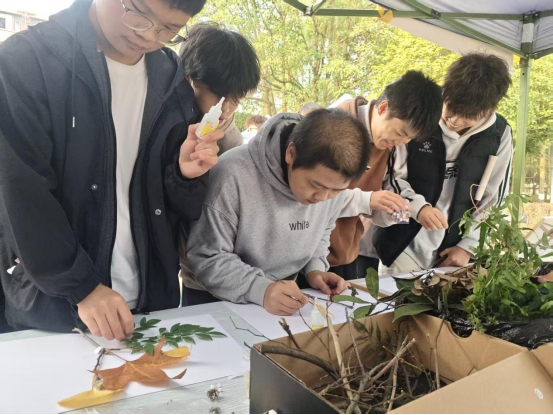 创作现场,同学们专注投入,或凝神构思布局,或细心裁剪拼接。干枯的枝丫在手中化身灵动的枝干,斑斓的落叶化作绚烂的花朵,小巧的松果点缀其间,原本寻常的自然素材在巧思组合中焕发新生。有同学以枯木为基,搭配金黄银杏叶,勾勒出对青春的憧憬;有同学用多彩干花点缀,诉说人际间的温暖。创作之余,大家主动分享作品背后的故事,交流创作时的心境,在彼此的倾听与共鸣中,学业压力与生活烦恼悄然消散。作品完成后,同学们纷纷在植物便签上写下寄语,定格此刻的心灵感悟。