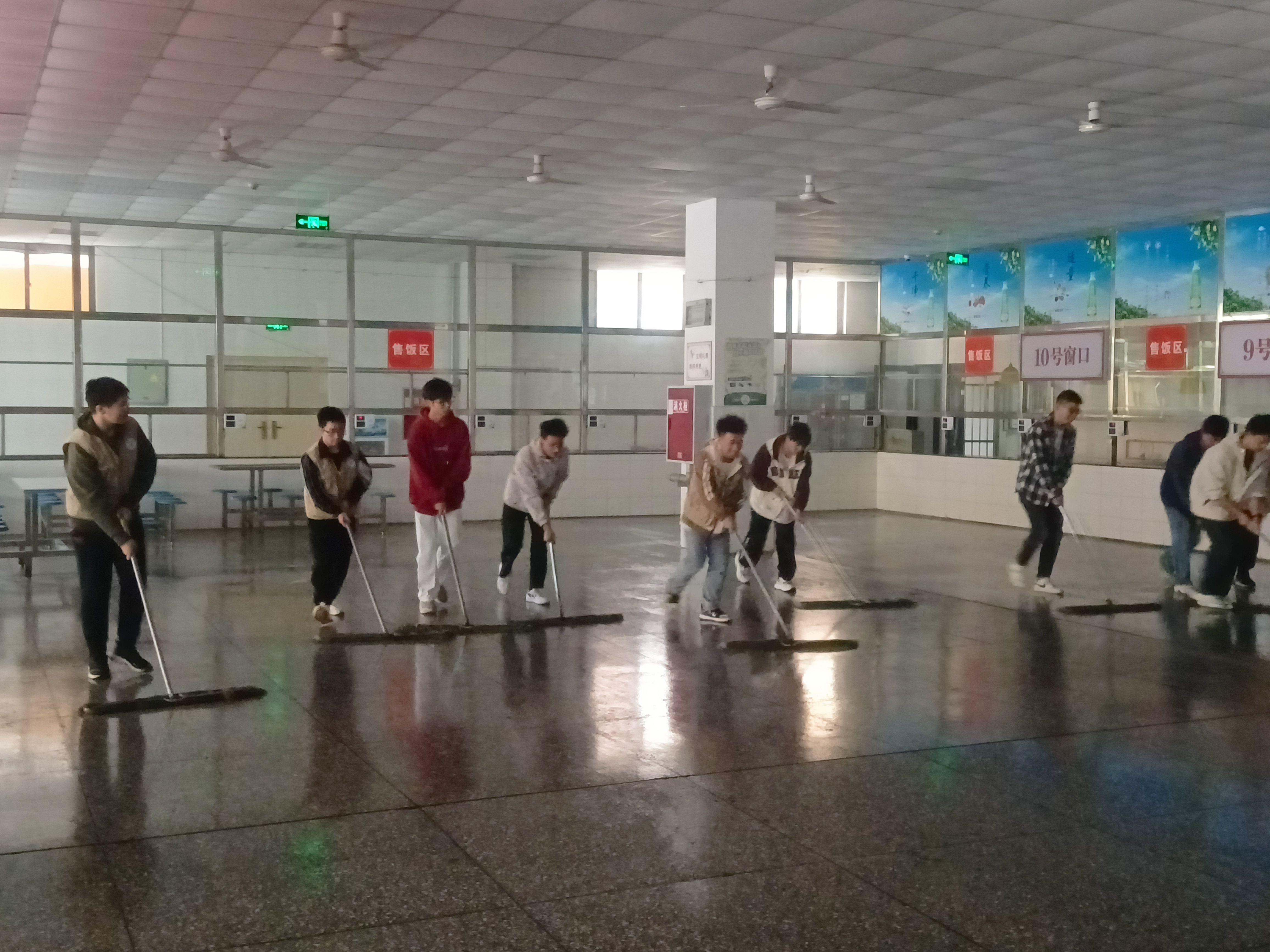 戴璐老师将此次劳动教育分成了三个环节:第一环节:理论教学,主要针对活动安全宣讲,打扫安全、卫生标准对60名新生志愿者进行集中理论教学;第二环节:实践活动,同学们挥汗如雨,激情饱满的投入到扫地、垃圾清理、洒水、固定资产搬移、擦玻璃、擦桌椅、除油渍、拖地、固定资产复位、打扫工具清洗并归类整理的工作中;第三环节:总结反思,卫生检查、评估、总结活动的不足和感受。通过志愿者们的辛勤打扫,两个小时后,食堂清洁明亮、焕然一新。