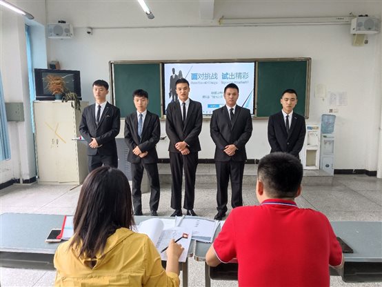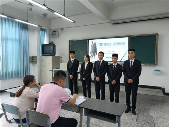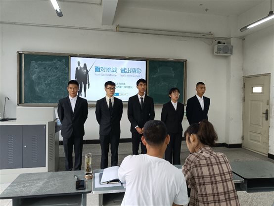本次模拟面试,同学们5人一组,进入面试教室,大家衣冠整齐、精神抖擞,虽难免紧张,却也表现出了应有的从容与自信。面试过程中,首先由每人依次进行一分钟的自我介绍,同时面试官审阅个人材料,接着由面试官对同学们展开提问,并根据他们的自我介绍、简历、仪容仪表、表达能力、专业知识等方面的表现作现场点评,并逐个给出针对性的指导意见,帮助他们扬长避短、不断改善。