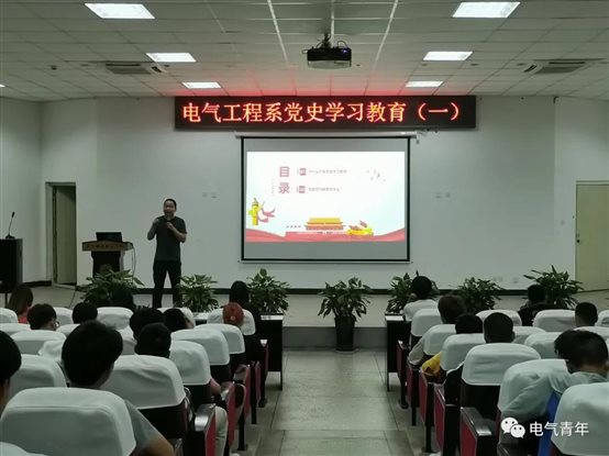 2021年5月13日,电气工程系组织学生在学术报告厅参加讲座(一):党史学习教育动员会。本次讲座由学生党支部书记陈光杰主讲。