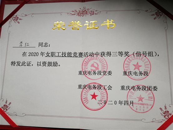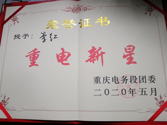 李红,女,中共党员,2019年毕业于电信工程系铁道通信信号专业。2019年7月-10月在重庆电务段北碚培训三个月,对工作兢兢业业,保持着良好的学习状态,最终以优异的成绩获得2019届优秀学员,并依靠成绩自行选择到綦江信号车间三江信号工区进行工作并担任车间团支部书记,主要从事工区台账处理,车间团支部工作开展,协助车间书记开展车间党支部工作。