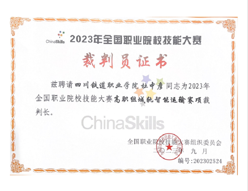 杜中彦遵照裁判工作手册要求,秉承公平公正的原则,圆满完成了执裁任务,得到了专家、裁判、监督仲裁员和参赛院校的一致好评,展现了川铁职院教师的专业素养和良好的精神面貌。通过此次执裁工作,有效地促进了行业内部交流学习,有助于学院专业教学水平的提升,积累了参加国家级技能比赛的经验,进一步扩大了学校的影响力。