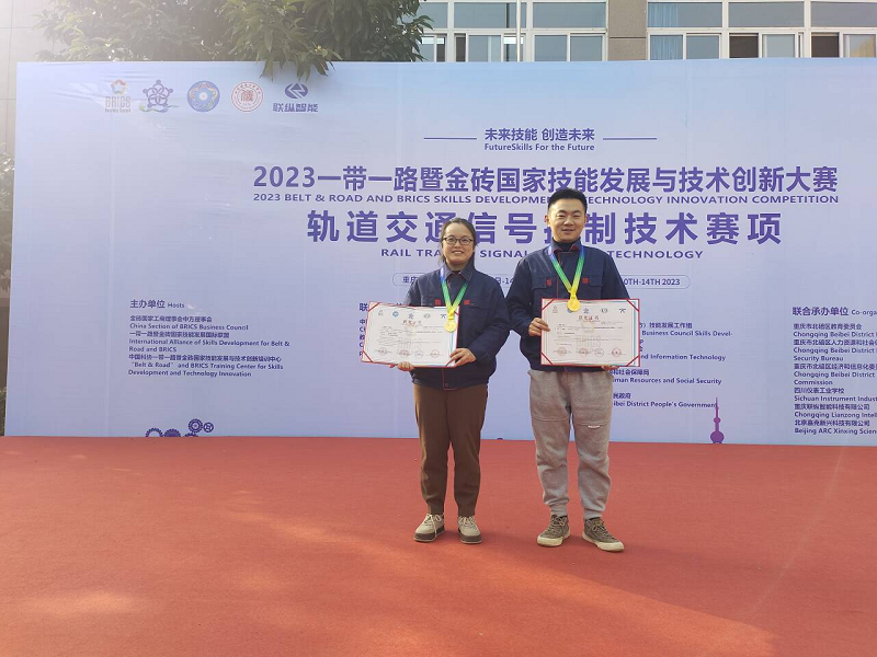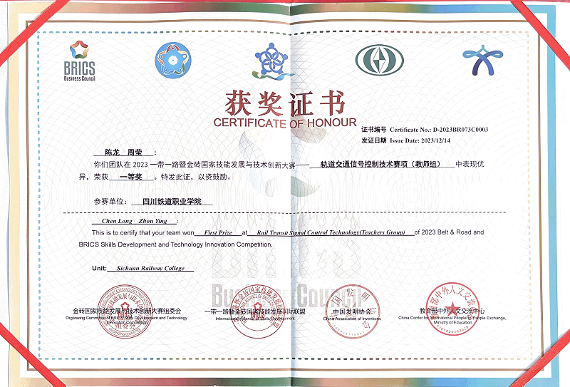 2023年12月14日,2023年第七届“一带一路”暨金砖国家技能发展与技术创新大赛轨道交通信号控制技术赛项全国总决赛在重庆闭幕。经过激烈角逐,伟德国际电信工程学院专任教师陈龙、周莹获得教师组一等奖;信号19A1班周盈佑、信号21T3班牛文晖获得学生组二等奖;学校荣获最佳组织奖,指导教师荣获优秀指导教师奖。
