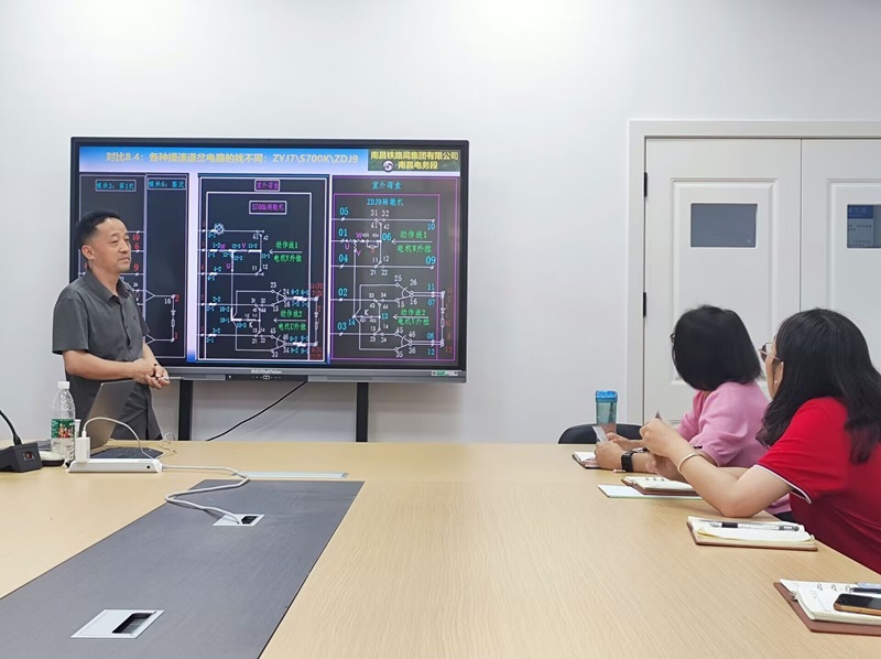 陈细华向全体老师介绍了提速道岔新电路原理以及电路图中动作线和电机外挂的新概念,重点对ZDJ9、ZYJ7、S700K三种类型的电路优化进行展示。结合现场职工培训和技术比武方面的经验,强调教学质量的重要性,并提出了一些有创意的教学方法,为老师们提供了实用的教学建议。随后,铁道信号教研室主任龚文元强调要注重培养创新精神要求老师们将新电路原理及新概念应用于课堂教学,认真打造一门金课,为专业建设奠定基础,同时号召全体老师向陈细华学习。会议最后,信号教研室老师进行交流发言,围绕教学中的困惑和心得,共同探讨教学方法的改进与创新。