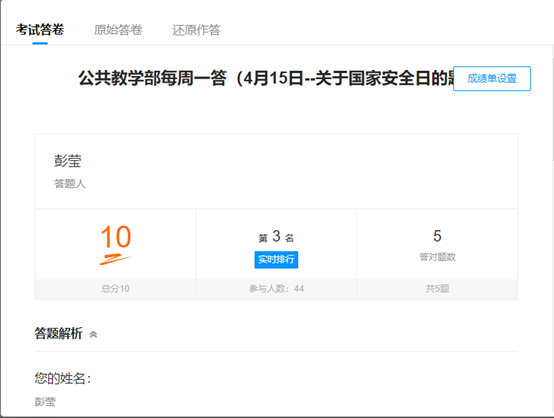 为营造学习氛围,党支部结合4月15日国家安全日主题,利用QQ问卷星发布“公共教学部每周一答”,检测学习效果,部门88%的老师都参与此次答题活动,督促部门教师及时了解国家最新安全政策和要求。