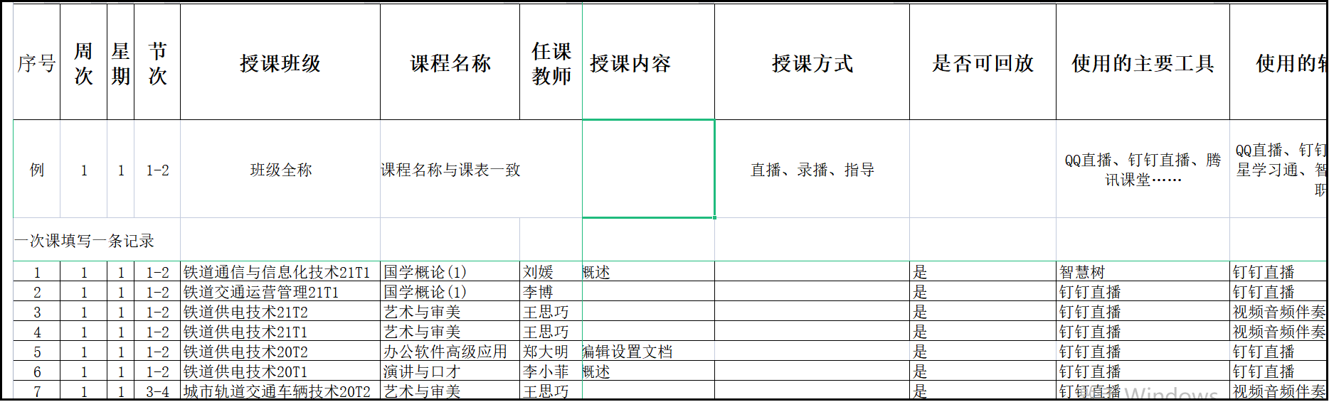 根据《四川省教育厅 四川省卫生健康委员会关于做好2022年秋季学期开学学校疫情防控工作的通知》文件要求,结合伟德国际《2022年秋季学期教学准备工作方案》《2022年秋季学期线上教学工作实施方案》的指导意见,在傅永华主任的精心组织下,公共教学部落实疫情防控要求,积极做好2022年秋季学期开学在线教学工作。 一、完善教学资料,保证教学实施 公共教学部的数学、英语、语文、艺术、体育和计算机各教研室根据专业人才培养方案、课程标准以及学院教学进程表,制定教学授课计划,认真做好在线教学工作;按照教务处最新教案模板修订本学期的教案,增加横向能力目标,关注教育教学的理念,认真填写在线教学日志等在线教学常规资料,提高老师的教学技能水平。 公共教学部线上教学实施计划一览表(校历第1周)