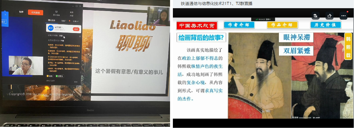 二、利用资源平台,保障线上教学 公共教学部教师通过钉钉直播、QQ直播、腾讯会议、智慧树、爱课堂等线上教学平台,参与创建在线教学课程工作。利用资源平台的课程资源,便于学生进行课前预习、课堂探究和课后拓展;利用直播软件的消息互动和连麦等功能,积极调动学生参与线上课堂,营造活跃讨论的课堂氛围;充分发挥钉钉直播的直播回放功能,方便学生课后复习巩固;利用学校云平台在测验题的发布、学生在线学习监督等方面的功能,发挥其监控作业完成情况、在线学习时长、在线批改、点评留言、疑问留言、数据统计等功能。