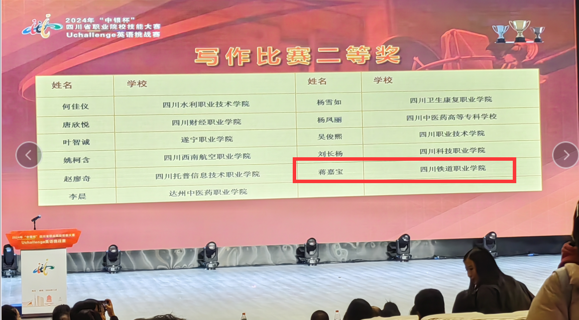 11月30日,由四川省教育厅主办,四川工程职业技术大学和外语教学与研究出版社承办的2024年“中银杯”四川省职业院校技能大赛Uchallenge英语挑战赛在四川工程职业技术大学圆满结束。经过激烈角逐,伟德国际学生在写作、演讲两个分赛项中荣获二等奖1项、三等奖2项。