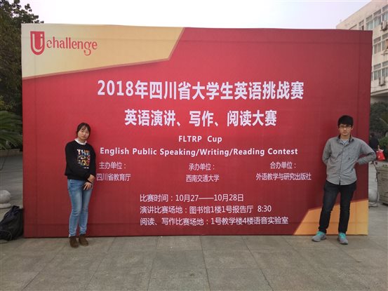 10月28日,我院学生代表赴西南交通大学犀浦校区参加由四川省教育厅主办,西南交通大学、外语教学与研究出版社承办的2018年四川省大学生英语(高职组)挑战赛。