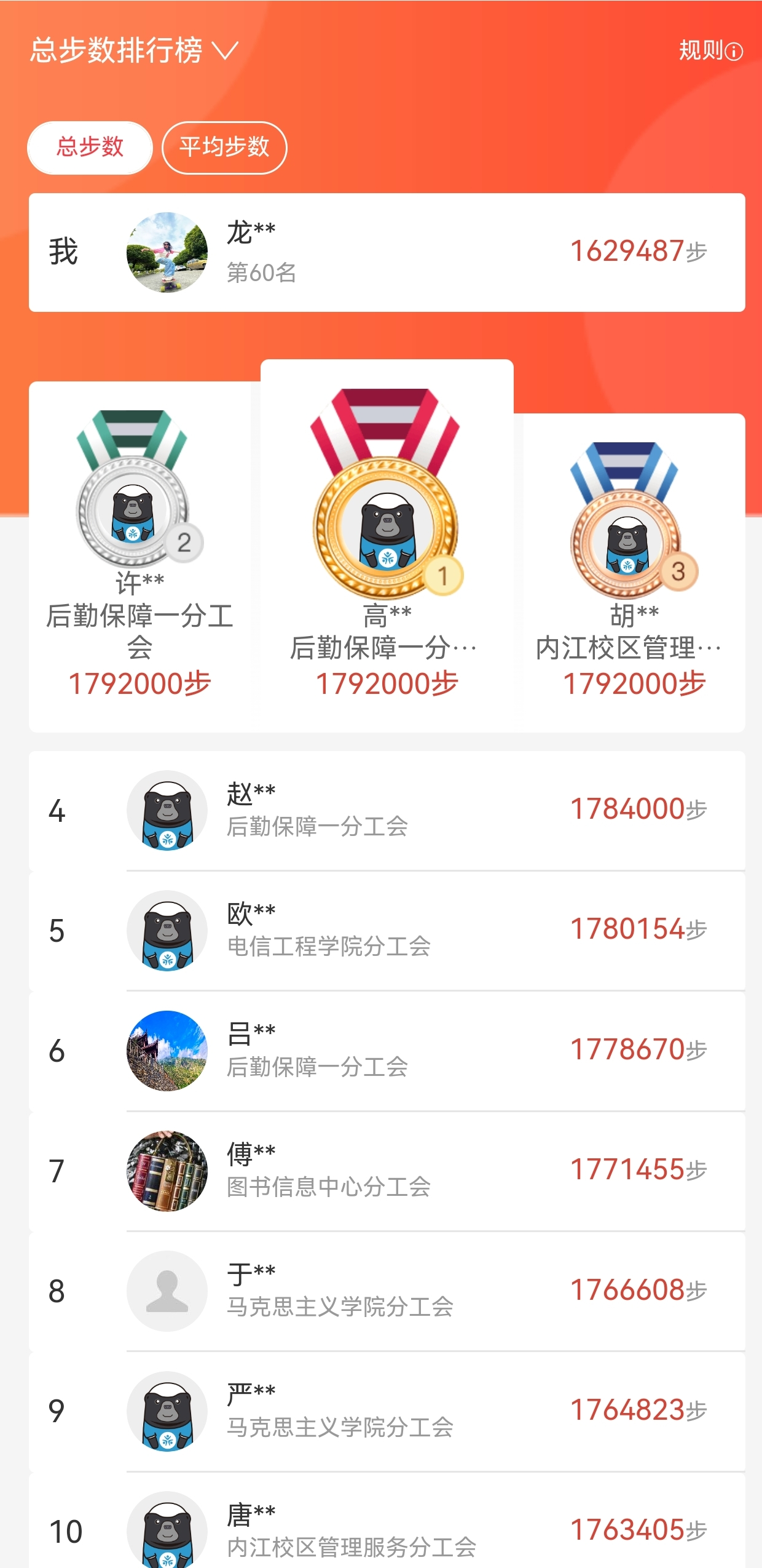 活动依托学校健步走小程序关联“微信运动”自动计步,教职工在室外便捷场地参与。活动中,广大教职工积极参与,第一名累计步数高达1792000步,展现了极高的运动热情。此次活动不仅响应全民健身号召,助力教职工增强体质、强化体重管理意识,更营造了健康向上的校园文化氛围,展现出教职工团结奋进的良好精神风貌。