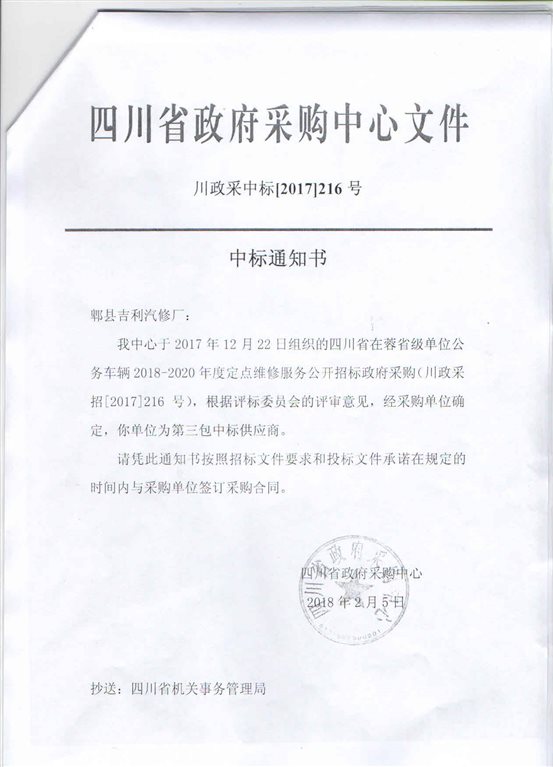 根据《四川省机关事务管理局关于2018-2020年度在蓉省级单位公务用车定点维修服务供应商名单及维修车型的通知》,我院与省机关事务管理局在郫都区遴选出的一家汽修厂签订了《郫都区行政事业单位公务用车定点维修服务合同》。