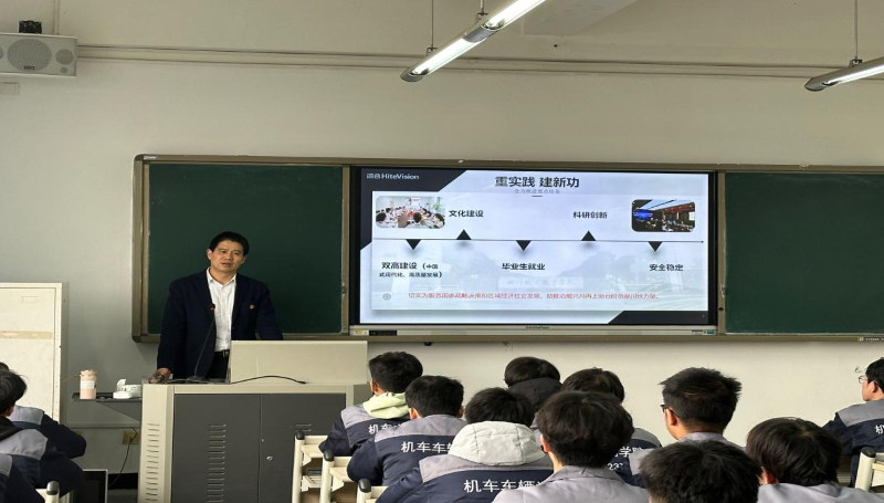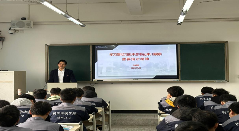 11月20日,机车车辆学院院长龙明贵为学院全体党员师生及联系班级铁道机车运用与维护23T2班在1402教室讲授“学习贯彻习近平总书记来川视察重要指示精神”专题党课。