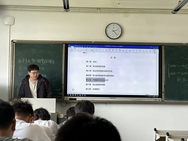 活动中,辅导员、班团干部领学《中华人民共和国职业教育法》《四川省职业教育条例》《四川省职业学校学生实习管理实施细则》等法律法规规章,结合案例分享“一带一路”中欧班列首发司机、优秀校友江彤优秀事迹、成都铁路局五四表彰优秀校友事迹,通过生动的讲授和鲜活的案例增强了学生对职业教育的认识,帮助学生进一步提升法律意识,明确职业发展路径,深入理解工匠精神内涵,激发学生对专业技能学习的热情,培养学生专注、精益求精的职业态度。铁道机车运用与维护23T1余瀚琳在活动中上分享个人的学习感悟:“职业教育的春天已经到来,我们要抓住机遇,通过技能成才创造属于自己的精彩人生!”