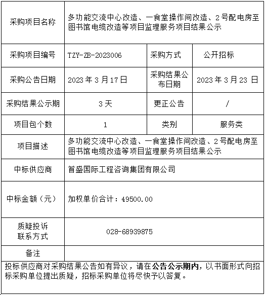 伟德国际英国多功能交流中心改造、一食堂操作间改造、2号配电房至图书馆电缆改造等项目监理服务项目结果公示