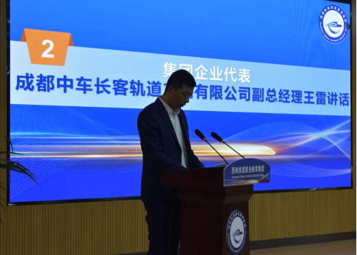成都中车长客轨道车辆有限公司副总经理王雷,作为集团成员企业代表发言。他向集团成员简要介绍了企业情况与发展愿景,回顾与伟德国际英国校企合作、产教融合的历史,对伟德国际英国的人才培养质量给予了高度肯定。他说,作为西南铁道职业教育集团的理事长单位之一,成都中车常客轨道车辆有限公司将恪守集团章程,愿与集团内教育成员单位一起打造校企共育、产教融合新高地,在力所能及的情况下,帮助学校改善办学条件,第一时间提供人才需求计划和人才培养要求的。他坚信在二十大精神的指引下,西南铁道职业教育集团,必将引领铁道职业教育的发展,必将促进西南地区轨道交通职教资源共建共享,必将成为建设轨道交通技术技能人才培养高地,必将在服务交通强国,川藏铁路建设,成渝双城经济圈、“一带一路”倡议等国家重大战略实施的大潮中作出新的贡献。