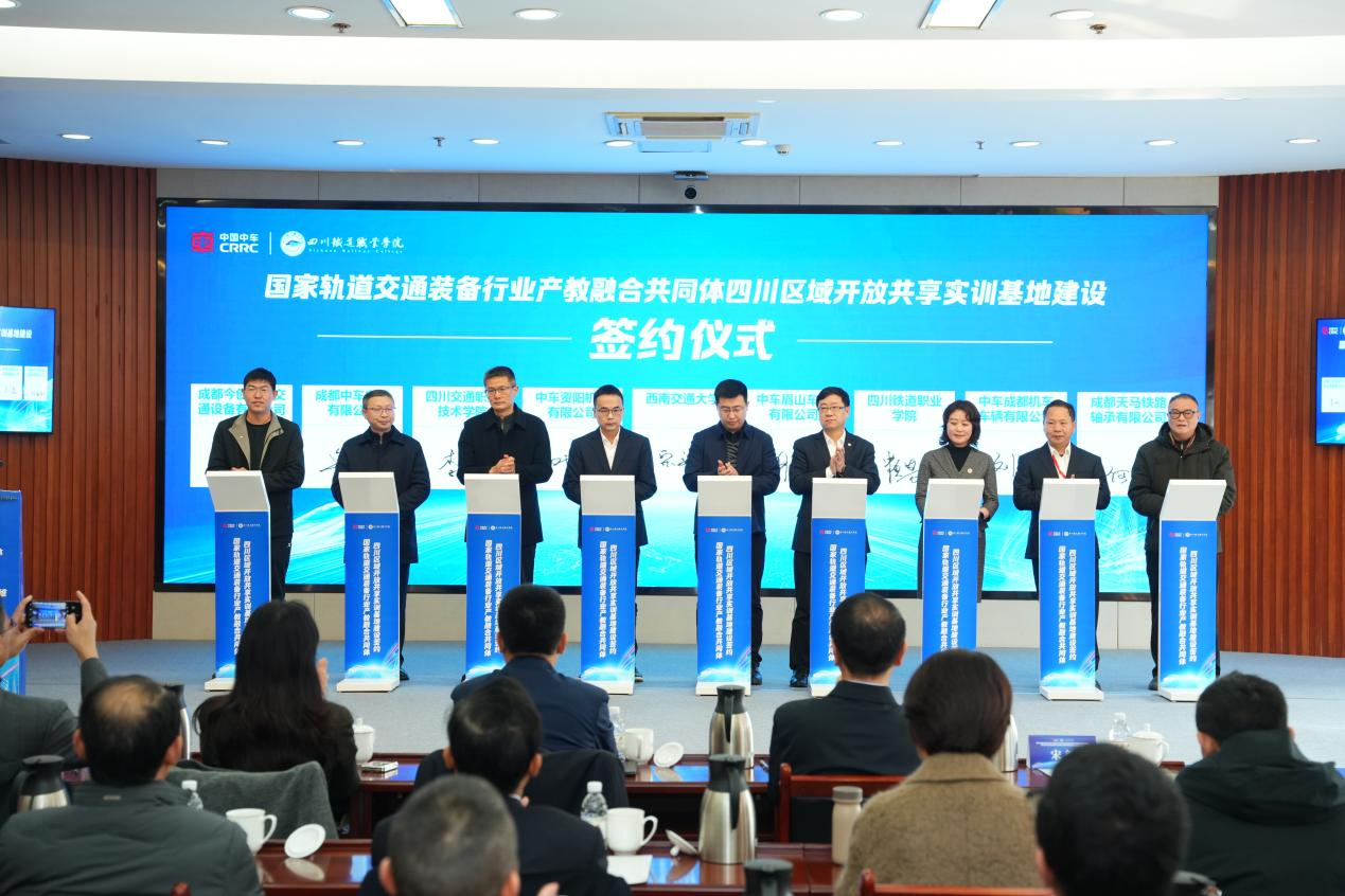 中国中车集团有限公司党委委员、工会主席赵虎出席活动并讲话。他指出,共享基地通过整合中车地方企业的职业教育资源,充分发挥地方高校人才培养与科学研究优势,打造了一系列开放共享的实训基地,这必将成为连接政府、企业、院校的桥梁纽带,推动地方产业和教育资源共享、优势互补、协同发展,优化人才培养结构,提升技术创新能力,为轨道交通装备行业的转型升级提供更坚实的人才保障和智力支持。此次国家轨道交通装备行业产教融合共同体四川区域开放共享实训基地建设签约仪式的举行,对于深化校企合作,促进教育链、人才链与产业链、创新链的有机衔接,具有重要的里程碑意义。他希望四川区域开放共享实训基地建设:一是要打造赓续红色基因、传承红色文化的 “示范校”;二是要打造轨道交通装备行业原创技术的 “策源地”;三是要打造轨道交通装备行业科技人才的 “孵化园”;四是要打造推进形成新质生产力的 “动车头”。