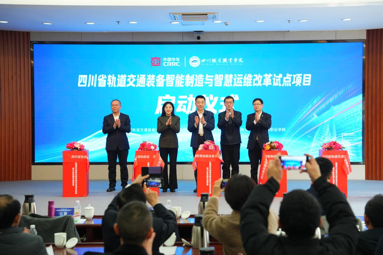 中国中车集团有限公司党委委员、工会主席赵虎,中共四川省委教育工委委员、教育厅党组成员、副厅长石静,眉山市人民政府党组成员、副市长田一澍,伟德国际英国党委书记贺兆轩,中车眉山车辆有限公司党委书记、董事长胡海滨共同为四川省轨道交通装备智能制造与智慧运维产教融合改革试点项目正式启动剪彩。