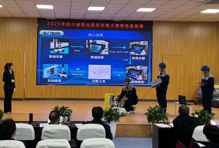 为深度践行职业教育“以赛促教、以赛促学、以赛促练”,扎实备战四川省职业院校技能大赛。2025年11月27日2025年四川省职业院校技能大赛校级选拔赛在学术报告厅隆重举行。来自5个二级学院的14支队伍参加了比赛。中国铁路成都集团局有限公司党校副校长陈小春、成都工业学院教务处处长蔡方凯、科研处处长肖尚辉、教务处副处长尹小辉到场担任评委。