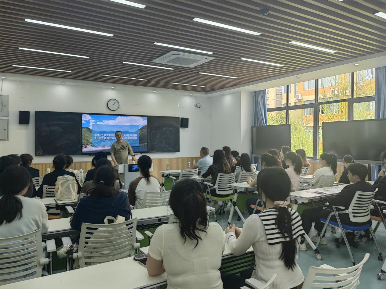 为进一步加强校企合作,4月10日下午,阿坝大九寨文化旅游投资发展集团九寨沟旅游分公司导游部副经理殷世荣、导游部主管唐咸等一行到校开展实习宣讲,经济管理学院40余名同学参加宣讲活动。
