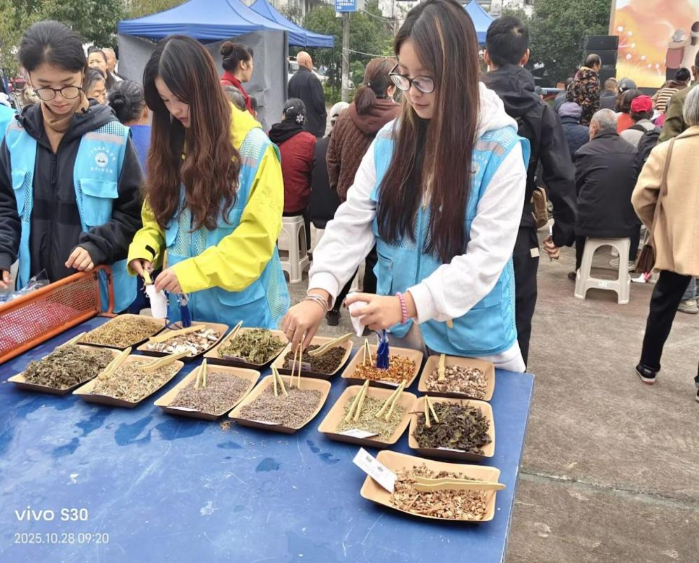 活动现场,一抹抹“志愿蓝”忙碌而有序地穿梭其间。志愿者们提前将艾草、薄荷、薰衣草等中药材分装摆放整齐,为接下来的香囊制作环节做好充分准备。他们一边耐心讲解秋季健康养生知识,一边引导老人参与互动,现场氛围亲切而融洽。