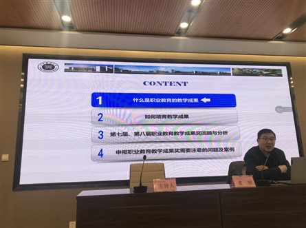 董刚教授将个人及学校教师所获奖项作为案例,详细阐述了高职院校应该如何培育教学成果奖。他从系统规划、重点保障,找准方向、突出特色,选好项目、提供平台,优化团队、形成合力等七个方面,以“不进则退、慢进则废”的理念结合成果奖的具体申报标准和要求进行了讲解。
